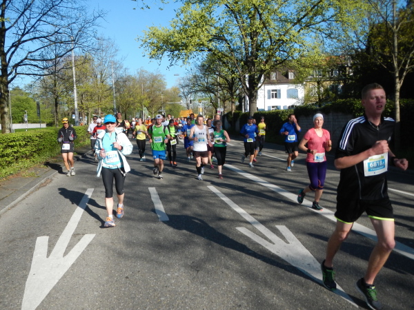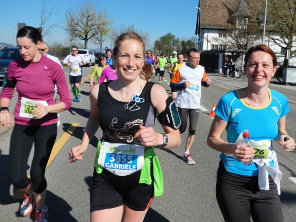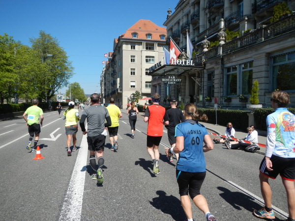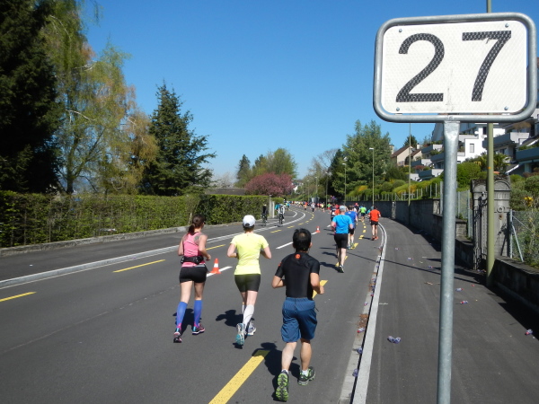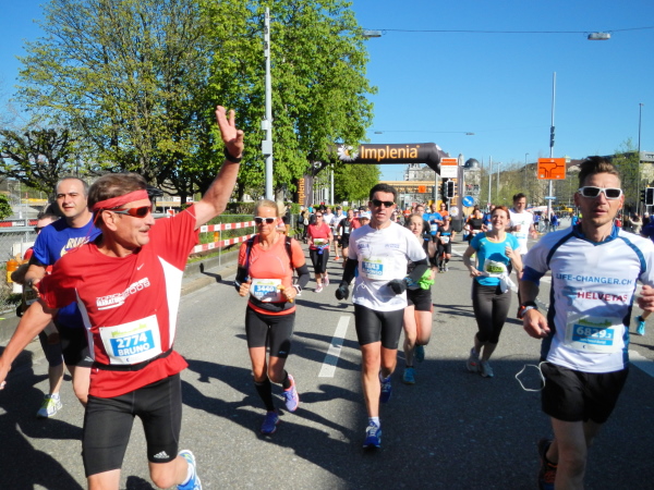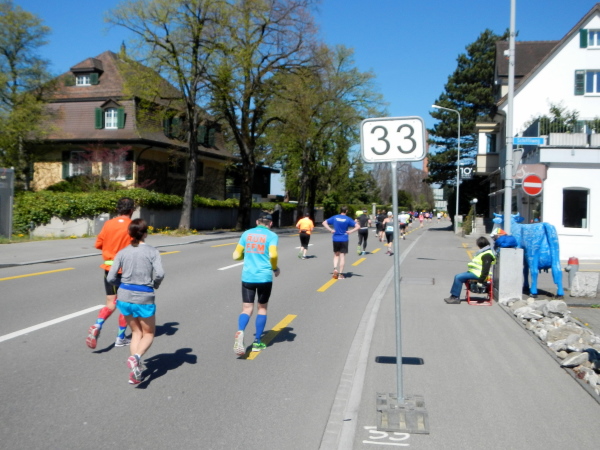 Mittlerweile liegt der Wendepunkt in Meilen mit Staffelwechsel, Volksfeststimmung, gutem Sound und damit Km25 hinter mir und ich kann den einen oder anderen entgegenkommenden Bekannten grüßen. Durch die Gemeinden der Goldküste geht es wieder zurück nach Zürich. Abgesehen von einer kleinen Steigung sind es nur minime Wellen im Streckenprofil. Die schon etwas ermüdeten Muskeln spüren diese aber mit ungeheurem Zehenspitzengefühl. Wie immer in Zürich fällt mir auf, dass bei einigermaßen gleichmäßiger Pace auf dem dritten Drittel das Einsammeln beginnt. Für den Sammelnden ermutigend, für die Eingesammelten nicht unbedingt frustrierend, da es sich bei den Überholenden sonst meist um Teilnehmer des Teamruns handelt.