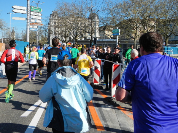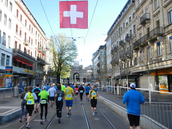 Der Countdown der letzten vier Kilometer vergeht recht schnell. Richtig eingetaucht in die Bahnhofstraße sind es nur noch drei. Am berühmt-berüchtigten Paradeplatz (teuerstes Feld im Schweizer Monopoly und Ausgangspunkt umstrittener Bankaktivitäten) sind immer noch nicht viel Zuschauer, um die Marathonparade abzunehmen, dafür habe ich die Möglichkeit, die Bahnhofstraße im Sonnenschein aus einem sonst nicht ungestört zugänglichen Blickwinkel, nämlich von der Straßenbahntrassee aus, zu bestaunen.