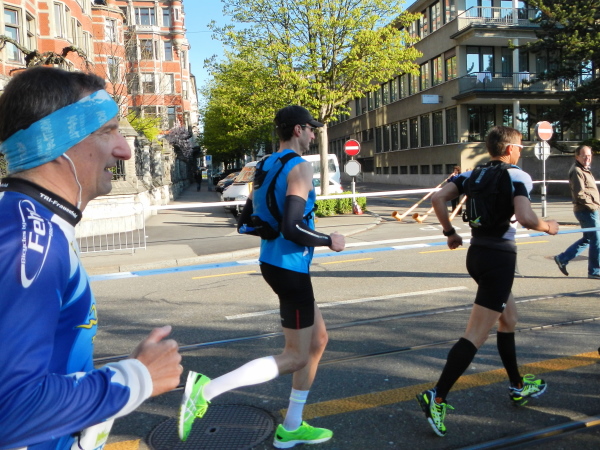Eine sanfte Wende führt auf der Parallelstraße zurück zum Zentrum. Vereinzelt klatschen sonntägliche Frühaufsteher von ihren Balkons herunter auf die im Schatten Laufenden. Weiter vorne sticht der von der hellen Morgensonne angestrahlte obere Teil des Opernhauses ins Auge. Dort biegen wir wieder auf die Straße zurück zum Bellevueplatz ein. Die „Bellevue“, die schöne Sicht, ist bereits entlang des Sechseläuteplatzes durch die neu errichteten Bauabschrankungen getrübt, dafür habe ich eine gute Aussicht auf die auf der Quaibrücke entgegenkommende Spitze. Ich halte mich an den Rand, um das Vorbeifliegen fotografisch festzuhalten. Statt im Fotostudio wähne ich mich aber umgehend auf dem Eishockeyfeld, mit dem Unterschied, dass man dort bei einem Bodycheck von der Bande gestoppt wird, ich hingegen ins Absperrgitter knalle und mit diesem zusammen auf die Tramschienen. Ja, es gibt auch unter Läufern absolute Idioten. Dabei hat dieser Teilnehmer des City- oder Teamruns zu diesem Zeitpunkt keinerlei Aussicht auf einen Podestplatz, denn den nachmaligen Zweiten auf der 10km-Strecke habe ich schon einen Kilometer zuvor an mir vorbeiflitzen sehen. Zwei Streckenposten sind umgehend bei mir, doch mein Abflug vom Streckenrand muss schlimmer ausgesehen haben als er war, die Sache geht glimpflich aus. Abgesehen von leichten Schürfungen ist mir nichts passiert und Tattoos sind in…