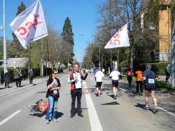 Etwas weiter vorne fehlen nur zwei Flügel und die engelhafte Erscheinung wäre komplett. Weiß gewandet und mit langem Haar läuft Charlotte, die Amerikanerin und Weltreisende in Sachen Marathon ihren 64-sten. Sie steht auf flache Strecken und hat Zürich auch deshalb gewählt.So auch die Spitzenläufer, welche bereits auf dem Rückweg nach Zürich angebraust kommen.