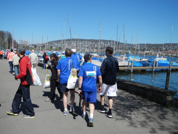 Den jungen Deutschen, der mit ins Bild kommt, bemerke ich erst gar nicht. Erst etwas später werde ich auf ihn aufmerksam, und zwar wegen der Aufschrift auf seinem T-Shirt. Er kämpft 42195 Meter für seine Schwester. Darauf angesprochen deutet Tobias auf die Vorderseite mit dem Aufdruck in klarer Finger- und sonstiger Sprache. Er kämpft nicht nur heute, sondern die Vorbereitung auf diesen, seinen ersten Marathon dauerte so lang wie der Kampf seiner Schwester gegen Krebs. Auf dem Weg dazu hat er nebenbei noch 30 Kilos auf der Strecke gelassen. Bei dieser Unterhaltung verpassen wir keine Sehenswürdigkeiten, denn es geht schlichtweg geradeaus auf der Bellerivestraße. Das „Bellerive“, das schöne Ufer, bleibt uns verborgen, doch je weiter wir uns dem Zürichhorn nähern, umso mehr kann man erahnen, dass diese Gestade den Namen zu recht tragen.