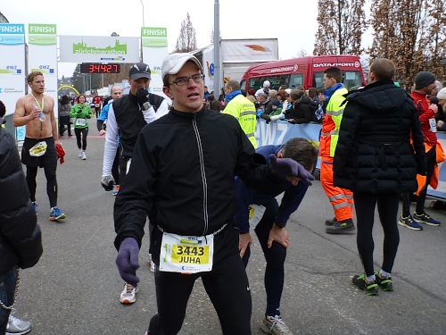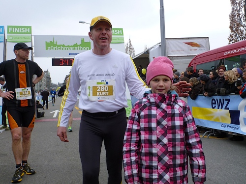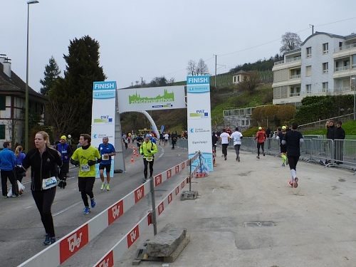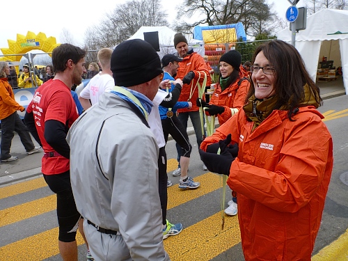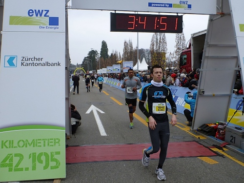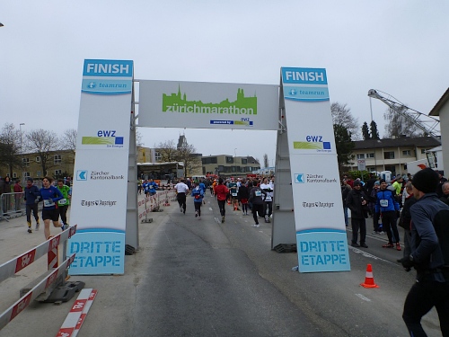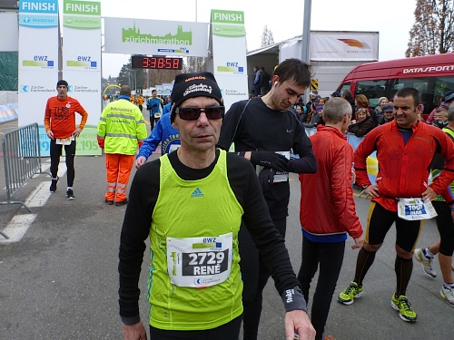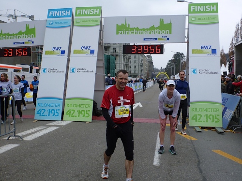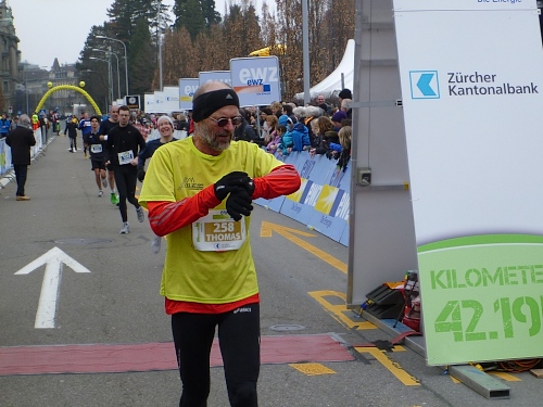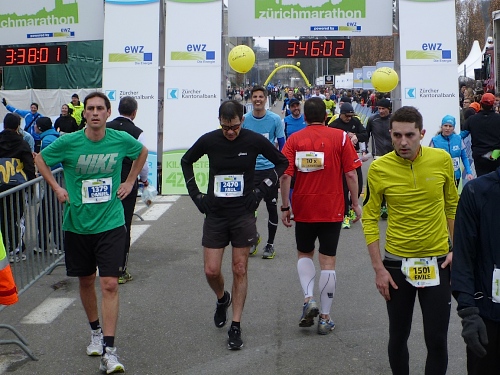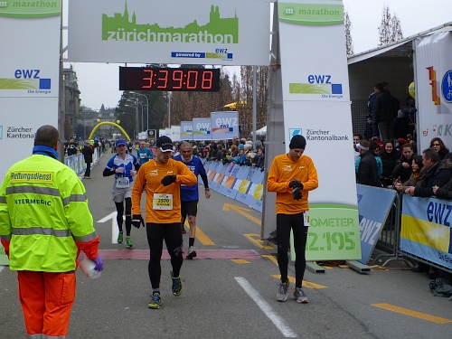 Der restliche Weg ist bekannt: Bürkliplatz, Bahnhofstrasse, die Aufmunterung der Zuschauer hat nicht nachgelassen, die Musiker spielen weiterhin ohne Unterlass. Wir lassen die letzte Tankstelle links liegen, denn der Körper kann eh nichts mehr aufnehmen. In der Talstrasse wird der letzte geile Kilometer angekündigt. Letztes Jahr konnten wir am Ausgang der Talstrasse hin zum See die schneebedeckten Berge sehen, doch jetzt hängt weiterhin am Himmel eine tiefe Wolkendecke. Auf dem General-Guisam-Quai biegen wir halblinks Richtung Ziel ein. Und dann laufen wir Hand-in-Hand unter dem Zielbanner durch. Ich sehe eine 3.34 Stunden auf der Uhr. Passt. Medaillen werden überreicht.