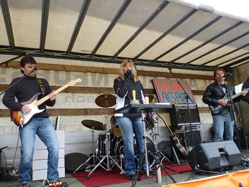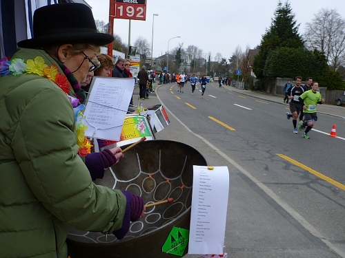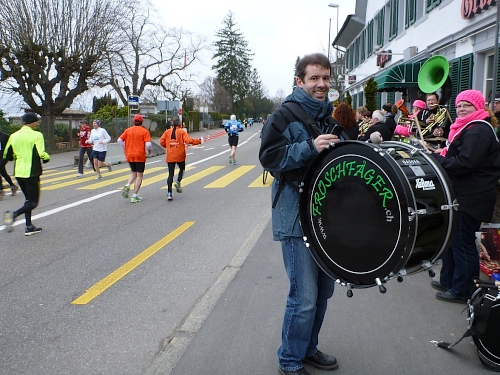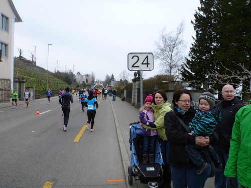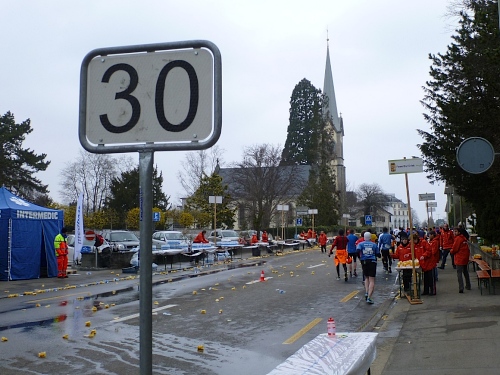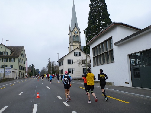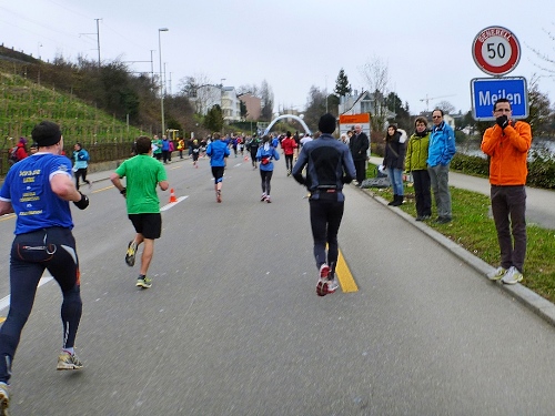 Die Rockband Hear Again macht uns schnelle Beine. Ja, für die einheimischen Teilnehmer wird es später noch einen Empfang (und Freibier) geben. Nach dem kurzen Wendepunkt in Meilen richte ich mein Augenmerk auf die andere Straßenseite, um Stefan zu sehen. Ich muss das allerdings nach wenigen Kilometern aufgeben, es strengt zu sehr an, da uns nun dichte Felder entgegenkommen. An den Zeitläufern orientieren sich viele Marathonis.