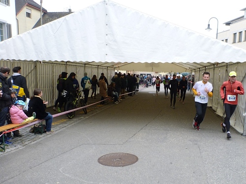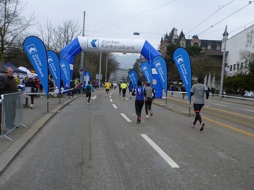 Nur einige Minuten später rennen wir auf der Alfred-Escher-Strasse in Richtung erster Wechselpunkt der Staffeln. Die schnellsten Teams sowie die Spitze der Cityrun haben die 10 Minuten Verspätung längst hereingelaufen. Die Wechselzone ist komfortabel eingerichtet: Die Teams werden vom Kurs ausgeleitet und parallel zur Laufstrecke übergeben die ersten Staffelmitglieder ihre Aufgabe an den nächsten Läufer. Die Zone ist von unserer Strecke abgetrennt, es kommt daher zu keinen Behinderungen. Im Vorjahr gab es hier Behinderungen und entsprechend kritische Stimmen konnten vernommen werden. Heute ist es zur Zufriedenheit gelöst.