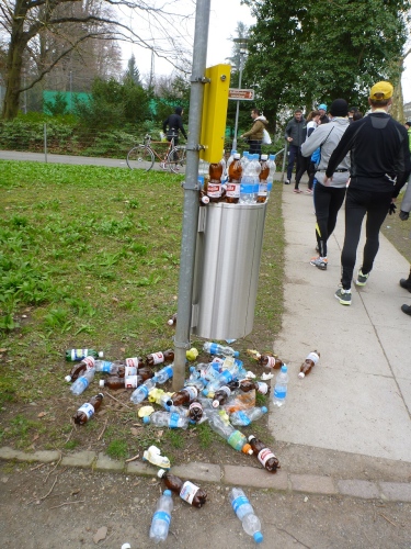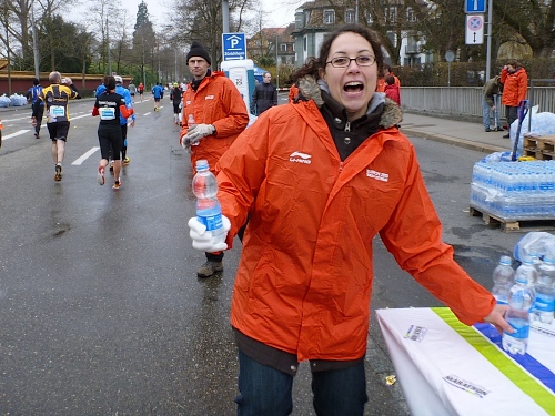 Ein Wort zur Verpflegung: Alle 2,5 Kilometer sind die Tankstellen mit Wasser in 0,5 Literflaschen eingerichtet. Und alle fünf Kilometer werden Isogetränke, Bananen, teilweise Gel und Riegel und am Ende auch Cola zugereicht. Mir sind die Getränke fast zu kalt.
