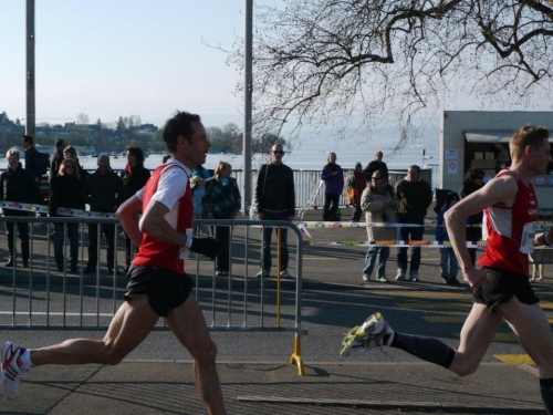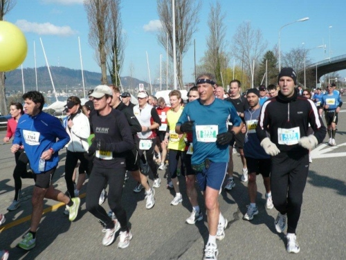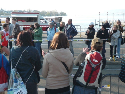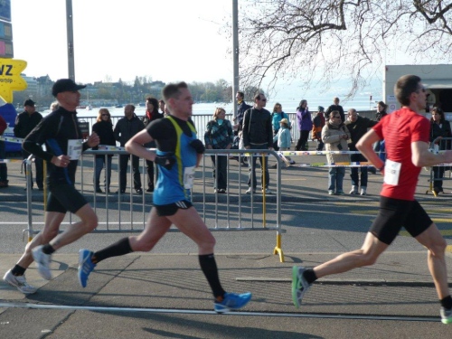 Nach einer weiteren Spitzkehre bin ich wieder auf dem Mythen-Quai und überquere erneut die Startlinie. Wieder beim Bürkliplatz angelangt, habe ich bereits einen Viertel des Marathons hinter mir und darf, von den dort zahlreich anwesenden Zuschauern angefeuert, mich weiter um das Seebecken herum auf die Begegnungsstrecke nach Meilen begeben.
