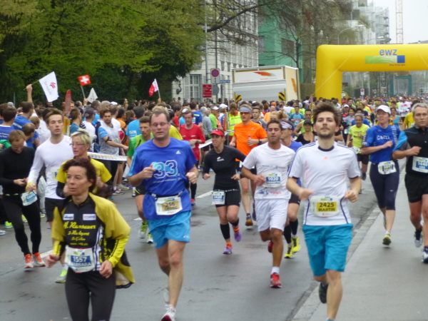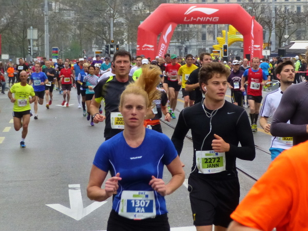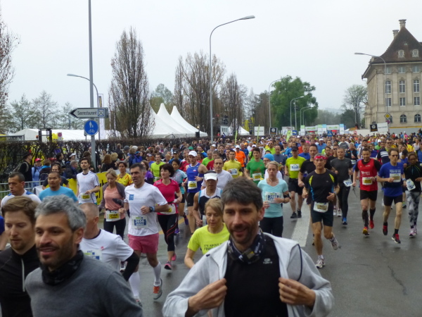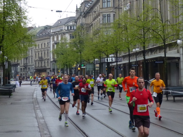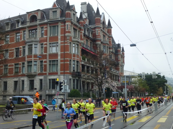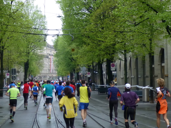 Ich setze meine kleine Wanderung durch den Park fort. Schluss mit der Beschaulichkeit ist auf der Uferpromenade, dem Mythenquai. Gewusel wie in einem Ameisenhaufen herrscht hier, wenngleich es auf den angrenzenden Wiesen auch Liegestühle für die ganz Relaxten gibt. Leider hat der Frühsommer seit gestern eine Pause eingelegt, was den wundervollen Blick durch den Segelmastenwald über den See und hinüber gen Zürich City etwas trübt. Ungetrübt ist allerdings die allgemeine Stimmung, auch wenn bis kurz vor dem Start vielen nicht so recht klar ist, wo denn nun eigentlich der Startpunkt ist. Doch bis 8:30 Uhr schafft es der Startmoderator dann doch, die Läuferherde in die rechte Position zu rücken. Und los geht`s. Einer Stampede gleich lassen die in diesem Jahr fast dreitausend Starter auf der Volldistanz den Asphalt erbeben und strömen direttissima der Innenstadt entgegen.