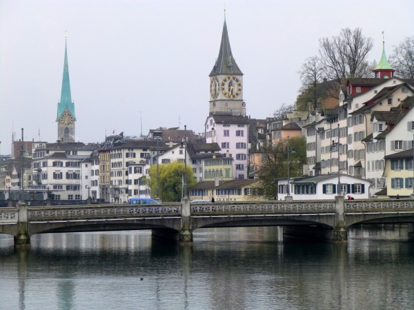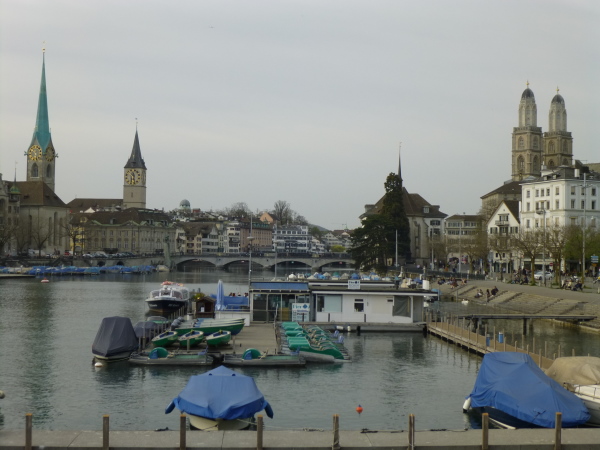 Via Quaibrücke queren wir die Limmat, die hier den Zürichsee verlässt und das historische Zentrum Zürichs durchschneidet. Ohne Zweifel einen der eindrücklichsten Panoramablicke unseres Kurses dürfen wir von der Brücke erleben: flussabwärts über die Altstadt mit den die "Skyline" prägenden Türmen von Groß- und Fraumünster sowie St. Peter, in der Gegenrichtung auf die sich am Horizonts verlierenden Küstenlinien und Fluten des Zürichsees. Apropos Fraumünster. Auch Kirchenmuffel sollten einen Blick ins Innere risikieren. Denn hier kann man einen Marc Chagall der besonderen Art erleben. Vom Meister des Expressionismus höchstselbst stammen die Fenster des Chors. Und wenn dann auch noch der Orgelmeister ein Ständlein gibt, dann ist die Atmospäre einfach perfekt.