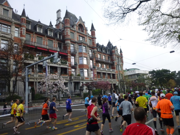 Schnurgeradeaus geht es den ersten halben Kilometer über den breiten Boulevard dahin. Am Arboretum mit prächtigem altem Baumbestand knickt der Kurs nach rechts ab und setzt sich über den General Guisan Quai, vorbei an überaus prachtvollen, fast schon schlossartigen Bürgerhäusern, fort, geradewegs dem Bürkliplatz an der Nordspitze des Zürichsees entgegen. Keinen Platz passieren wir so oft wie diesen auf unserem Streckenkurs: fünfmal insgesamt. Das bedeutet auch: fünfmal dichtgedrängte Zuschauerreihen, fünfmal eine Klangwolke aus Beifall und Anfeuerungsrufen, fünfmal zusätzlicher Motivationsschub.