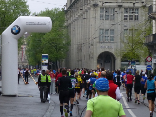 Fast schon können wir den Start-Ziel-Bereich erschnuppern, aber so schnell geht es dann doch nicht. Eine kleine Schleife müssen wir drehen, ehe wir den Mythenquai quasi von hinten wieder aufrollen dürfen. Mit großem Hallo einschließlich Cheerleader Girls-Empfang geht es unter dem Zielbogen hindurch. Zur überbordenen Stimmung trägt auch bei, dass gleich nebenan der Einlauf der immerhn 2.500 10 km-Cityläufer eingerichtet ist. Die sind zwar erst zehn Minuten nach den Marathonläufern gestartet, doch haben die Spurtstarken das Marathonfeld längst von hinten aufgerollt. Während für die einen das Rennen zu Ende ist, geht es für die Marathonis jetzt erst richtig los.