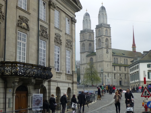 Vom Platz zweigt unser Kurs nun nach rechts ab und bringt uns via Bahnhofstraße direkt ins Herz der Altstadt hinein. Der Straßenname mag für Außenstehende banal klingen. Doch die Bahnhofstraße ist die Züricher, ja die Schweizer Edelmeile schlechthin. Juweliere, Modedesigner und alles sonstige, was Shopping edel, exklusiv und unerschwinglich macht, geben sich hinter prächtigen neoklassizistischen Fassaden die Klinke. Auf dem Paradeplatz treffen wir gleich auf mehrere hochkarätige Insignien Schweizer Klischees: Hier repräsentieren die Credit Suisse mit einem neobarocken Bau a la Stadtschloss den Finanzplatz Zürich, das Grand Hotel Savoy Baur en Ville die Schweizer Hotelleriehochkultur, das legendäre Cafe Sprüngli das Schweizer Schololadenimperium. Und um das Schweizklischee zu perfektionieren, geben drei Alphornbläser ihr bestes.