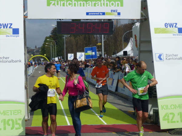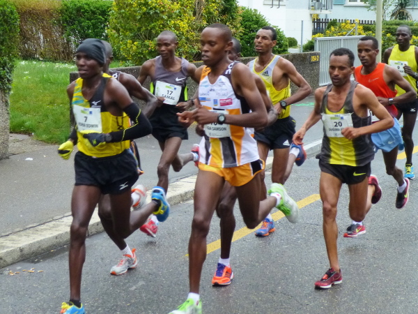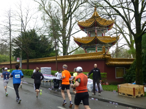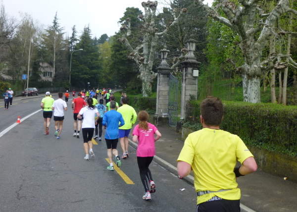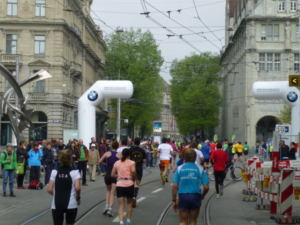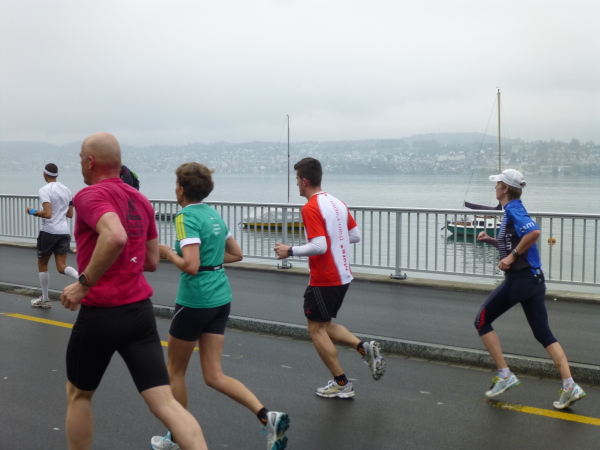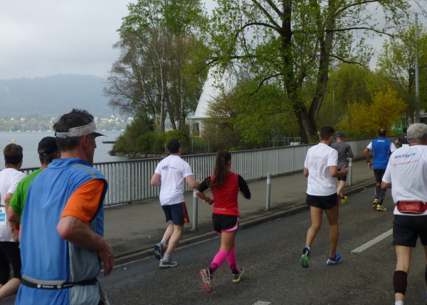 Eine aus der Streckenführung resultierende weitere Besonderheit des Zürichkurses ist, dass letztlich jeder jedem zumindest einmal begegnet, den Spitzenläufern ebenso wie dem Letzten vor dem Besenwagen. Man kann sich, je nachdem, ob man die vielen Läufer hinter oder aber vor sich im Fokus hat, motivieren oder auch frustrieren lassen. Interessant zu beobachten ist natürlich vor allem die Spitze. Bereits bei km 18,5 zieht eine ausschließlich dunkelhäutige Armada aus Kenia und Äthiopien, eskortiert von Motorrädern, leichtfüßig und mit weitem Abstand vor dem Rest des Feldes an mir vorbei. Kurz rechne ich hoch: Bei km 31,5 sind sie schon und der Schnellste, der Äthiopier Hayle Lemi Berhanu, wird in 2:10:39 durch das Ziel jagen. Einfach unglaublich. Dass nach dem 5:00 Stunden-Pace-Läufer kaum noch jemand folgt, zeigt aber auch, dass das Durchschnittslaufvermögen der Teilnehmer ein wohl überdurchschnittliches ist.