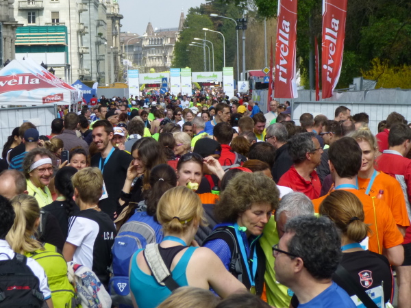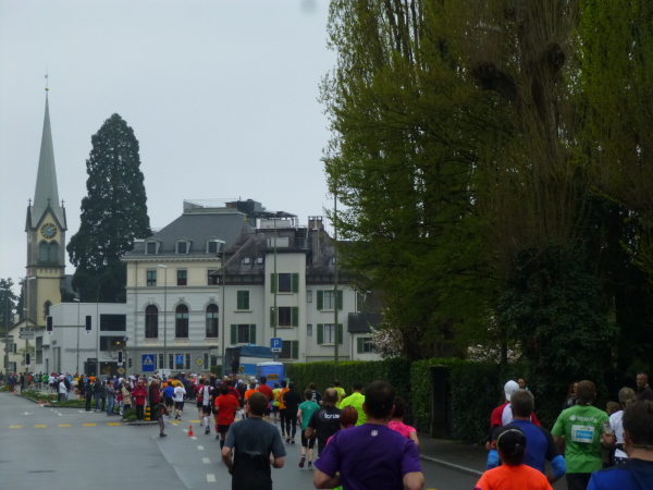 Dass auf dieser endlosen Geraden nicht zu oft das Gefühl der Eintönigkeit aufkommt, liegt auch am Schweizer Publikum. Wenn auch nicht ganz so spektakulär wie in Meilen, so erwartet uns in den verschiedenen Dörfern unterwegs immer wieder Partystimmung. Kuhglocken in allen Größen werden geschwenkt, mit typisch schweizerischen "Hopp, hopp"-Rufen werden wir auf Trab gehalten, Musikgruppen mit Blasmusik über Samba bis Rock spielen auf, „Speaker“ heizen über Lautsprecher die Stimmung zusätzlich an. Professionell und durchdacht ist auch die Streckenversorgung: Wasser in praktischen Kleinflaschen und Bananen gibt es entlang der gesamten Strecke alle 3,5 km, in den gleichen Intervallen ab km 15 auch Iso-Getränke und Energieriegel. Power-Gels werden bei km 15 und 33 bereit gehalten und für den letzten Kick gibt es zum Schluss Cola.