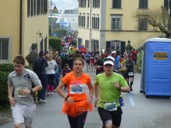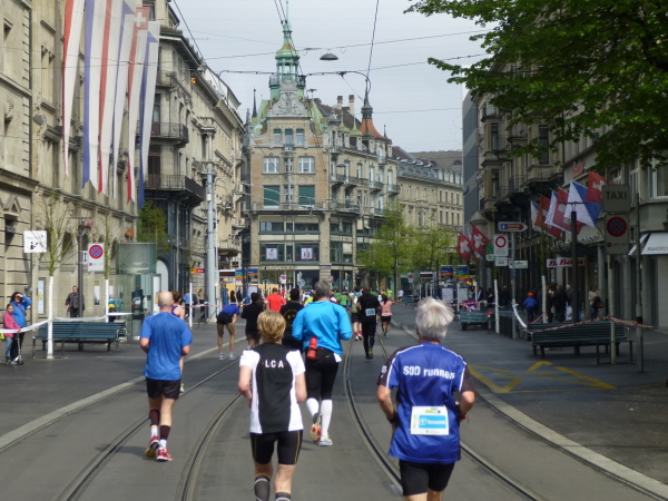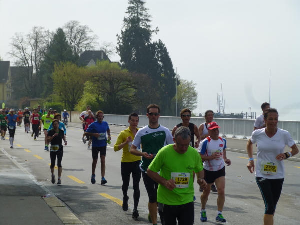 10 km sind geschafft – 32 liegen noch vor uns. Schon geradezu vertraut erscheint das erste Stück der Runde zwei. Über den General Guisan Quai geht es entlang des Zürichsees erneut zu dessen Nordspitze, über Bürkliplatz und Quaibrücke um diese herum und über Bellevueplatz und Utoquai ans Ostufer. Dank fortgeschrittener Vormittagsstunde säumen Zuschauer mittlerweile fast durchgehend zwischen Bürkli- und Bellvueplatz den Streckenrand und verabschieden uns lautstark auf die lange Gerade entlang des Ostufers, die uns bevor steht, eine bis zum km 25-Punkt währende Laufreise über die Dörfer am See.
