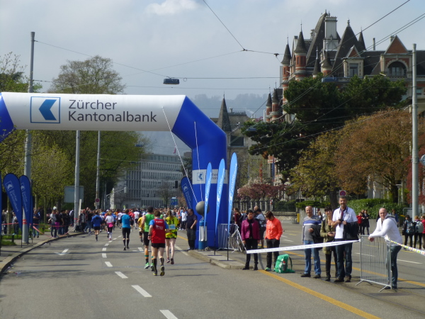 Noch einmal führt uns der Kurs die Bahnhofstraße hinab, durch die umgebenden Gassen gen See zurück und zum fünften und letzten Mal über den Bürkliplatz. Der letzte Kilometer kennt keine Umwege mehr. Direkt geht es gen Mythenquai, die Allee entlang, dem Zielbogen und dem Lärm am Horizont entgegen. Vom Publikum lasse ich mich auf den letzten hundert Metern über den grünen Einlaufteppich ins Ziel tragen.