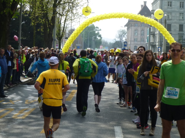 Die Kilometer ziehen sich letztlich aber doch. Nicht jeder kann sein Tempo halten, die Marschierer nehmen zu. Doch es gibt auch andere. Kurz hört man es hinter sich trappeln, schon zieht jemand vorbei. Doch im Regelfall sind es nicht übermotivierte oder von plötzlichen Energieschüben befallene Marathonis, sondern am Rückenschild als solche sofort erkennbare "Team-Läufer". Immerhin 900 Vierer-Staffeln sind unterwegs und mischen das Feld auf.