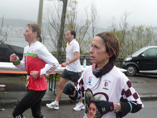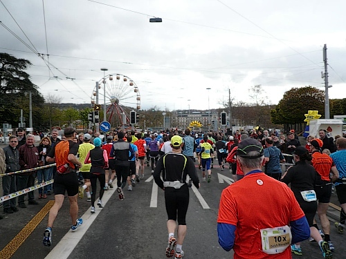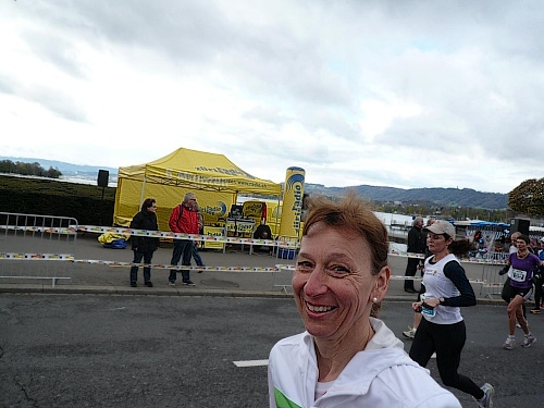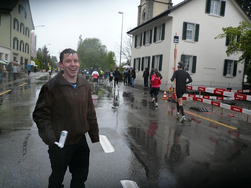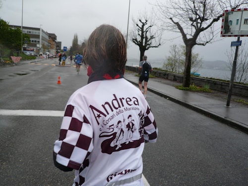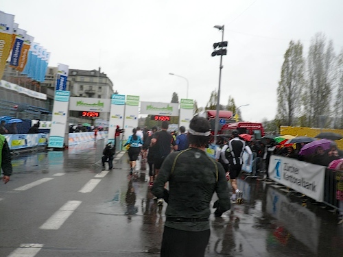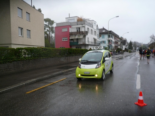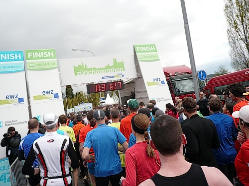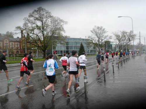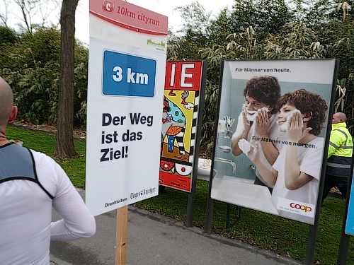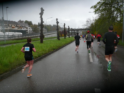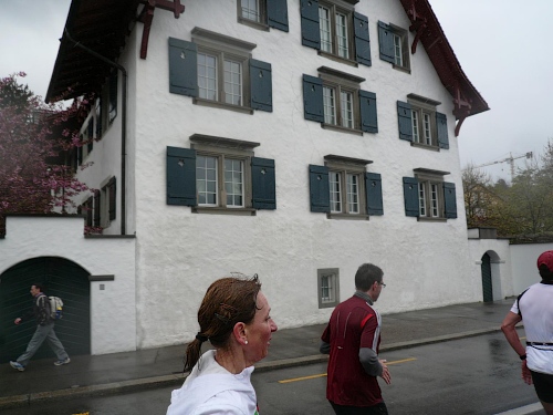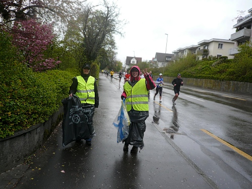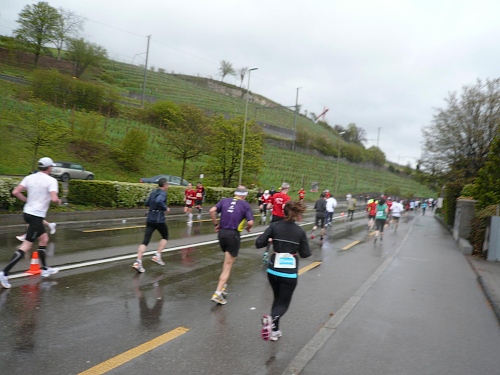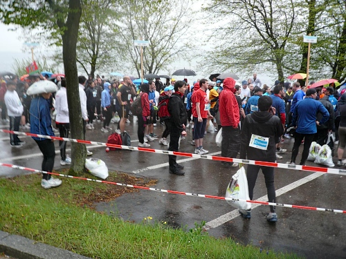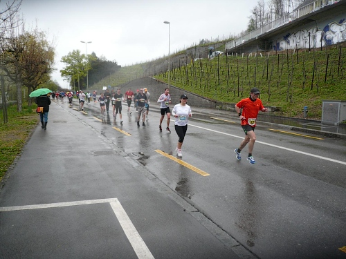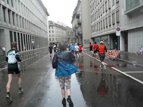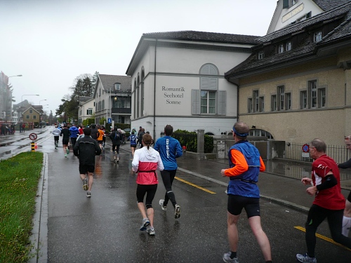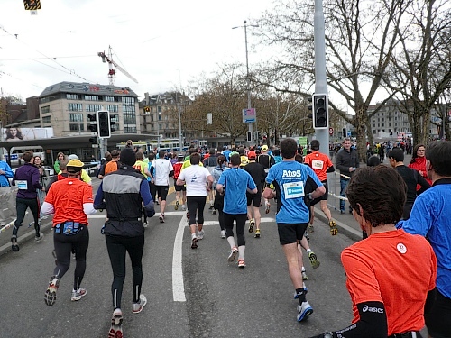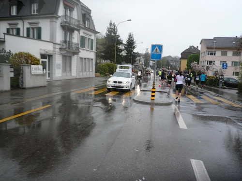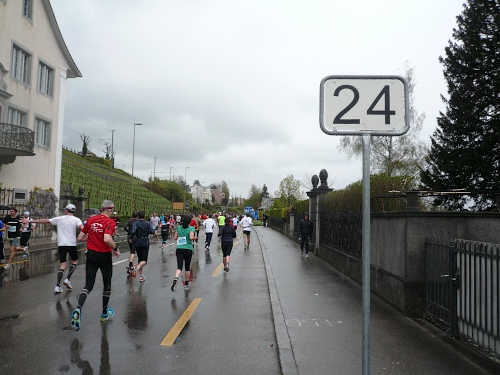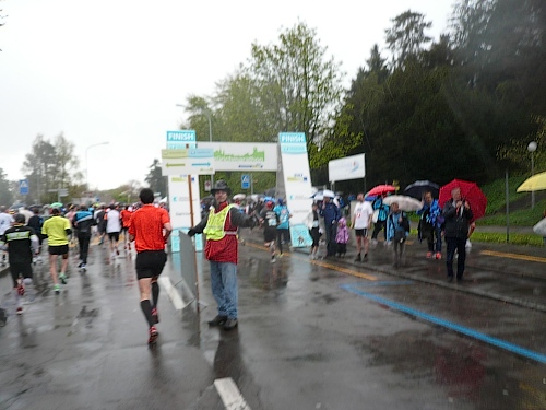 Wir laufen nun Richtung Startgelände auf dem General-Guisan-Quai und dann auf einer Parallelstraße, wo an dessen Ende der erste Wechsel der Staffetten stattfindet. Hier muss ich die Teilnehmer kritisieren, denn die Staffeln benötigen fast die ganze Straßenbreite. Nur etwas mehr als 1,5 Meter haben die Marathonis in der Breite Raum und müssen für fällige Überholmanöver den Randstein hernehmen.