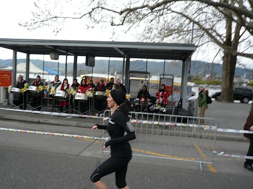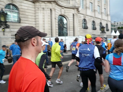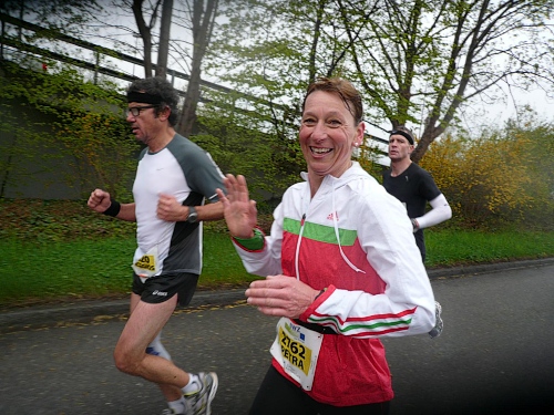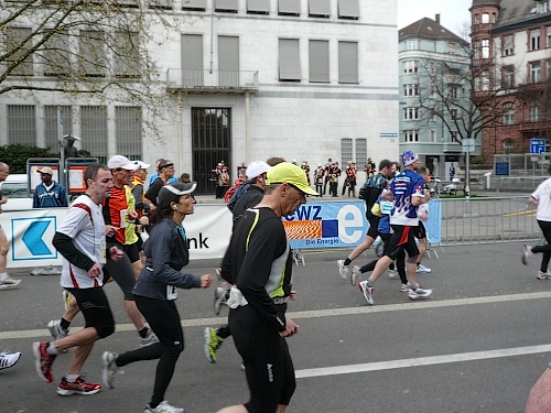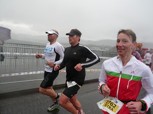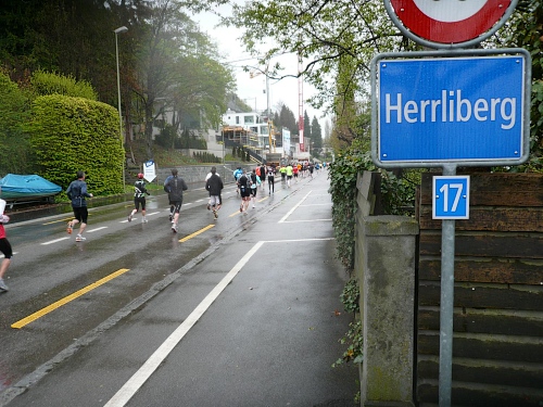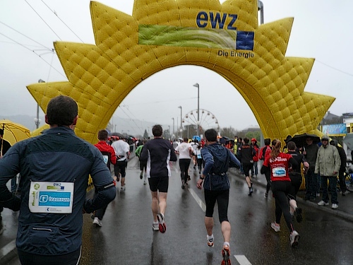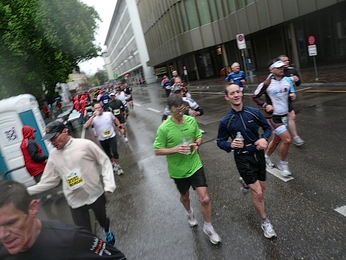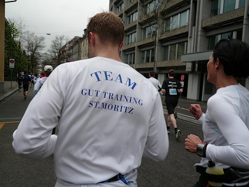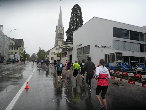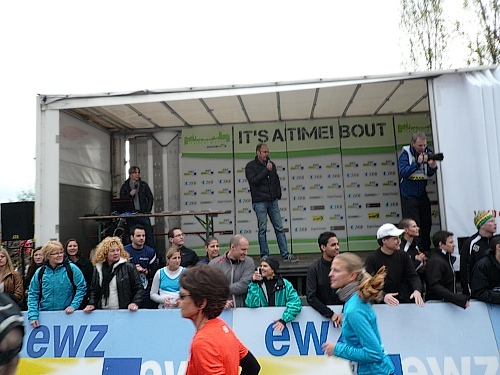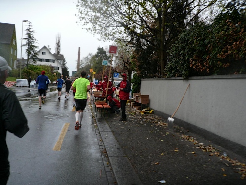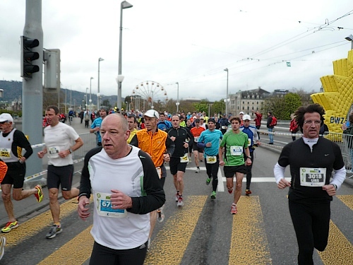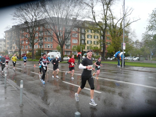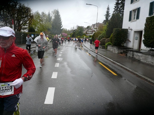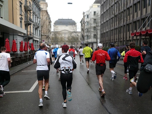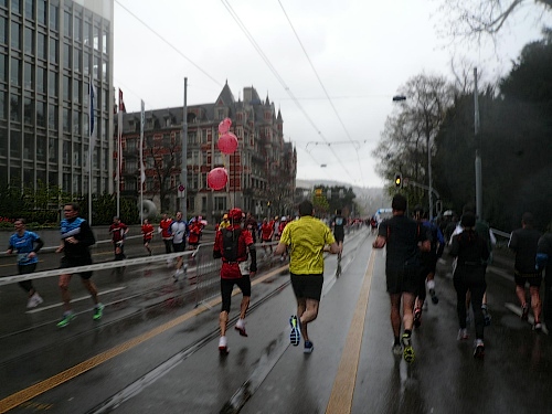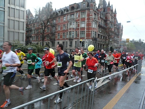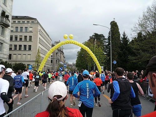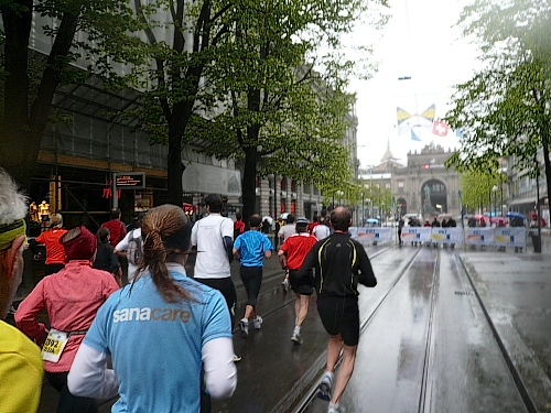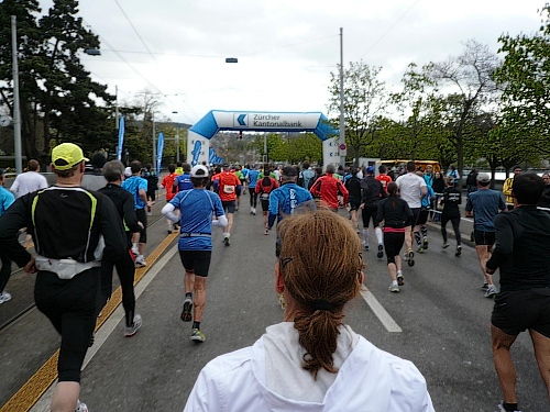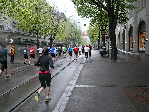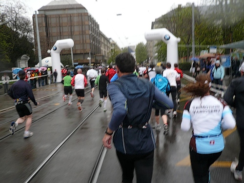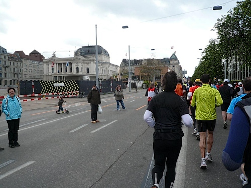 Die ersten zehn Kilometer unseres Kurses sind identisch mit dem 10 km Cityrun (der startet 10 Minuten später). Es geht nach Norden am Kongresshaus vorbei Richtung Bürkliplatz. Links und rechts stehen viele Zuschauer, die nicht mit Applaus und Beifall geizen. Ich höre eine Gruppe mit Trycheln lautstark bei der Arbeit.