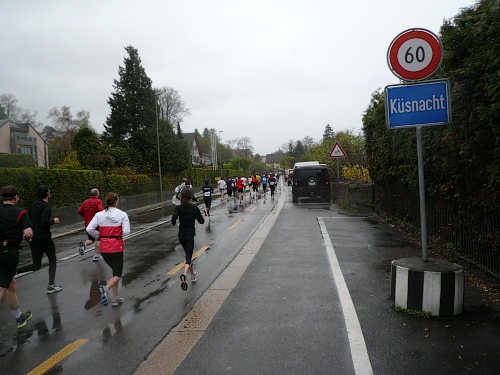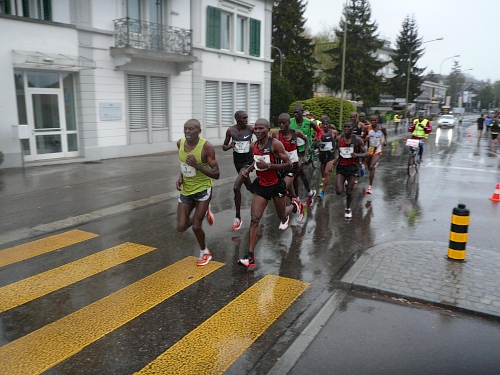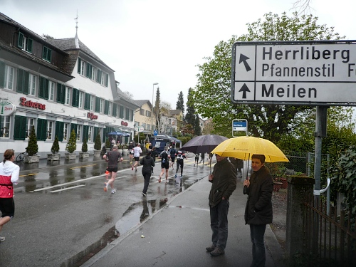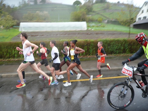 Frühzeitig kündigen vorausfahrende Fahrzeuge die Spitze des Marathons an. Etwa bei Kilometer 17, 18 ist es soweit. Am Führungsfahrzeug lese ich 1.35 Stunden als Zeit und kurz dahinter rennen elf schwarze Hasen um Geld und Leben. Kein einziger Weißer ist darunter, das fällt auch Petra auf. Dann dauert es eine ganze Weile, bis einzelne Verfolger zu sehen sind. Kurz vor Herrliberg kommt die Spitze der Frauen, die natürlich von einigen Pacemakern geführt werden. Drei Frauen kann ich ausmachen.