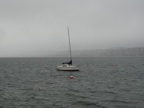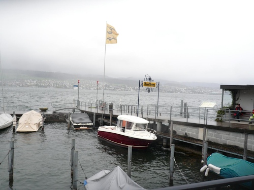 Bürkliplatz, schier eine Begegnung der dritten Art: Ungemütlich von oben, Wasserpfützen von unten und Spritzwasser von quer. Wasserrinnen parallel zu den Straßenbahnschienen. Ich fluche, als in eine hineintappe und mir eine Ladung Ha-Zwei-O in den anderen Schuh spritze. Da könnte man einen Pegelstand ermitteln, denn es schmatzt im Schuh.