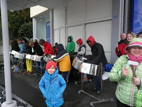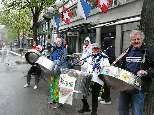 Doch im Bereich Bellevue und Quaibrücke kommt Unruhe ins Feld. Es beginnt nämlich zu regnen. Am Bürkliplatz, wo das Feld insgesamt sechs Mal zu sehen ist, biegen wir nach rechts in die Bahnhofstraße ab. Gestern war da natürlich mehr los, aber das ist halt sonntags so in den Fußgängerzonen. Mitglieder der Steelband Sandflöö haben sich schon die Kapuzen hochgezogen. Sie sind aber weiterhin fleißig am Musik machen.