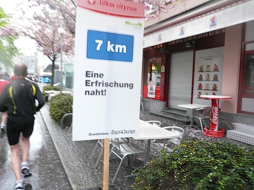 Kurz vor dem Bahnhofsplatz biegen wir nach links und laufen über Uraniastraße und Talstraße wieder Richtung See. Der Wind hat mittlerweile aufgefrischt und ist garstig. Mit einem lauten Scheppern wirft er sogar drei, vier Metallständer um. Das Feld wird erneut unruhig und schneller. Petra merkt das sofort, und gibt mir den letzten Kilometersplit durch. Deutlich unter fünf Minuten. Also langsamer, auch wenn es schwerfällt. Es passt aufs Auge, denn auf einem Kilometerschild lese ich „Eine Erfrischung naht“.