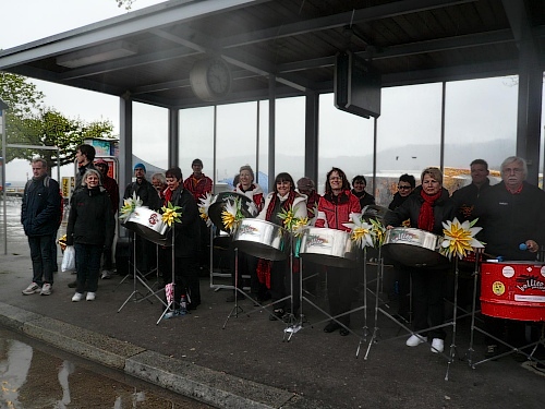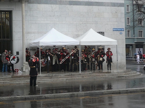 Zwar hat man in den Ortschaften Zollikon und Küsnacht immer wieder Deckung vor dem Wind, aber bei offenen Stellen pfeift es vom See heran. Das wird noch „spaßig“, wenn es wieder zurückgeht. Die Musikanten halten sich tapfer und spielen weiter, auch wenn die Kälte in die Finger kriecht. Die fünf Seelandgemeinden lassen es krachen, das habe ich aus 2009 noch gut in Erinnerung.