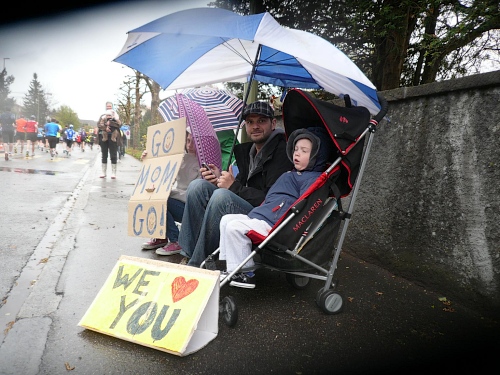 Zwei Helferinnen haben sich mithilfe der Kehrrichtsäcke einen Poncho gegen das Nass gebastelt. Die Gruppe um den 3-Stunden-Pacer kommt entgegen. Es hängen geschätzte 20 bis 30 Marathonis dran. Bei jedem Fotoschuss rechne ich, dass der Kasten den Geist aufgibt.