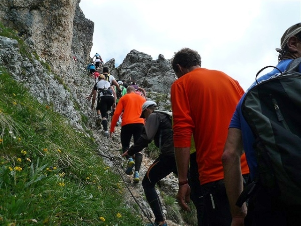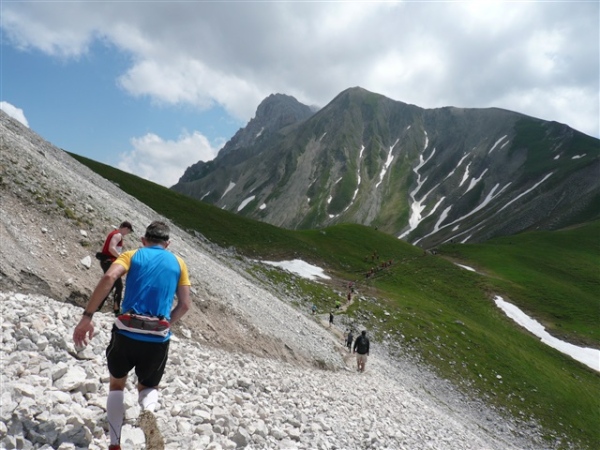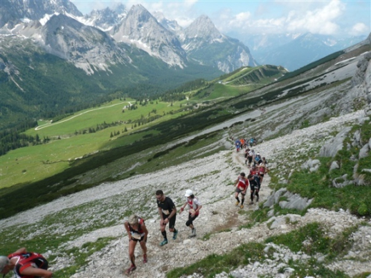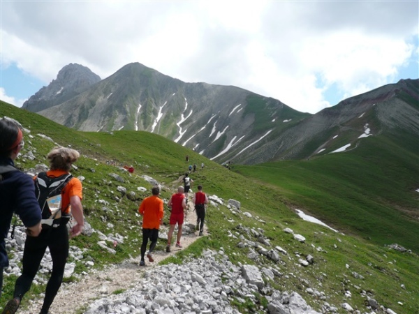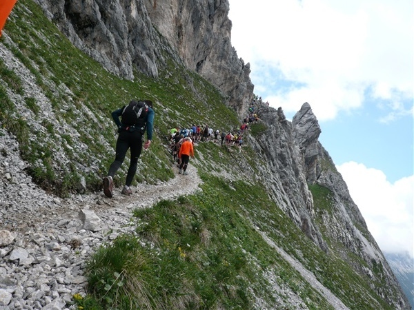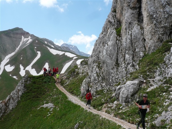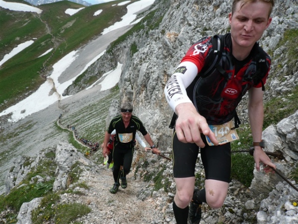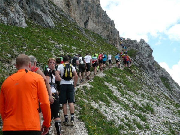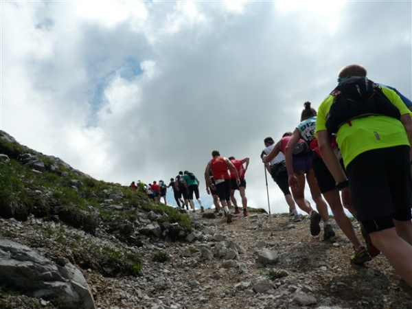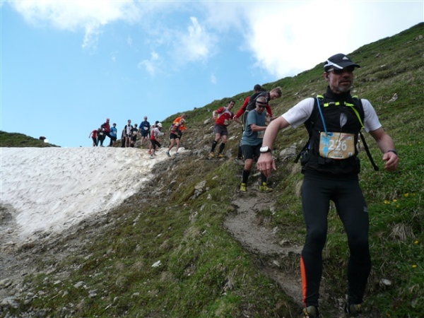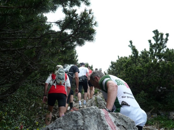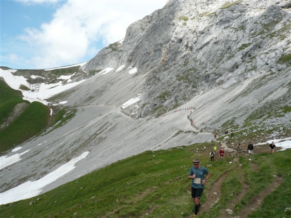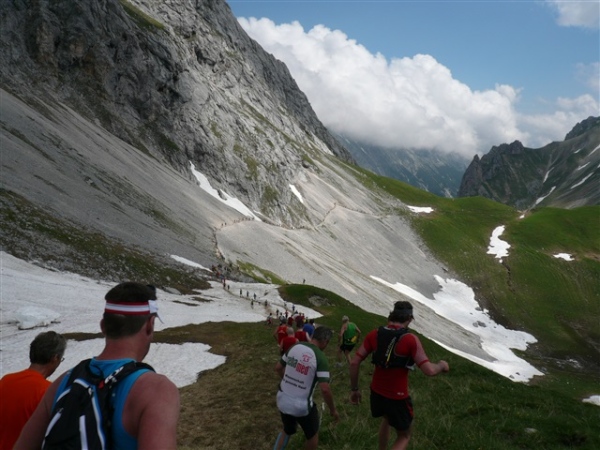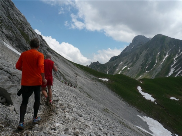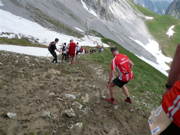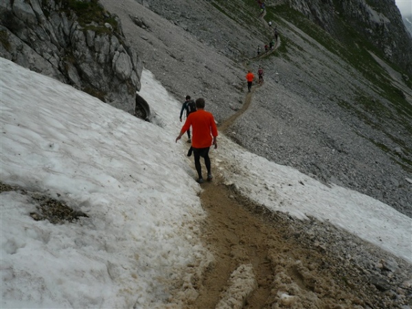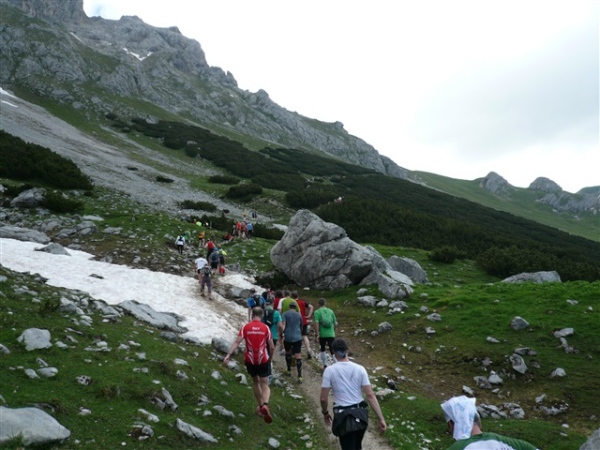Dann kommt das erste Schneefeld: Ich bin heilfroh, Trailschuhe mit grobem Profil anzuhaben, so komme ich zunächst im Flachen ganz gut durch. Ich will nicht wissen, wie es, insbesondere im Steilen, denjenigen gegangen ist, die mit normalen Straßenlaufschuhen unterwegs waren. Purer Leichtsinn! Nicht einmal Bäume können einen noch auf kurzem Wege aufhalten, denn fast schon ist die Baumgrenze erreicht. Mit schweren Schritten stapfen wir weiter bergan, an Laufen ist einstweilen nicht zu denken. Überholen ist schwierig, trotzdem versuchen es einige, sagen wir mal Unentwegte, trotzdem. Stürzen sich mit Stöcken bewaffnet rechts an uns vorbei, um sich Sekunden später im Geröll zehn Meter weiter unten wiederzufinden. Nicht nur die Bergrettung betrachtet das Ganze mit Kopfschütteln.