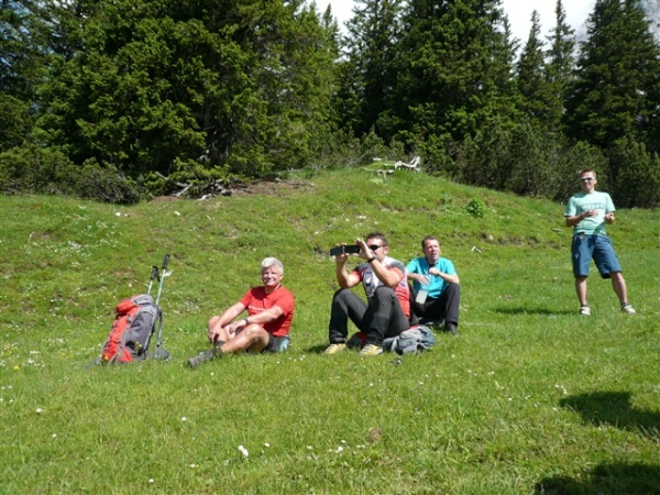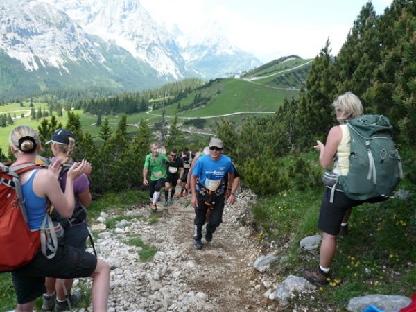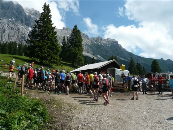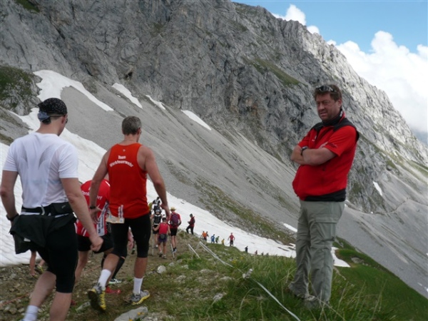 Nach ziemlich genau fünf km haben wir die Bergstation der Bahn und damit die Ehrwalder Alm erreicht. Freundlicher Beifall wird von den zahlreichen Zuschauern gespendet und wir haben allen Grund, uns bei der ersten Labestation (so muß man hier ja sagen) für die Unterstützung zu bedanken. Ich bin schon klatschnaß geschwitzt und brauche dringend Nachschub. Wenn ich nicht wüßte, daß es oben sehr viel kühler sein wird, würde ich mir am liebsten die zu warmen Klamotten vom Leib reißen, aber hinsichtlich später bin ich richtig angezogen.