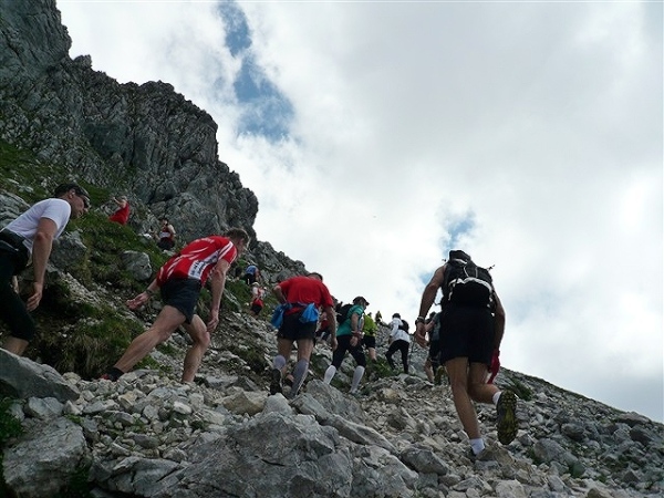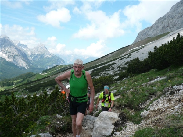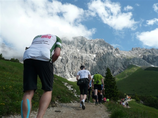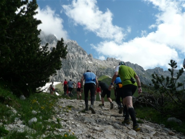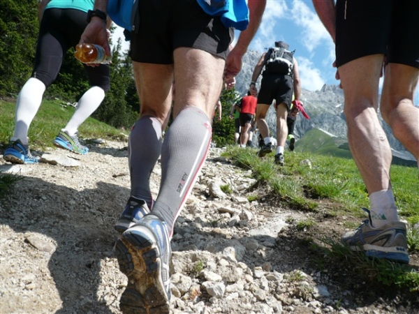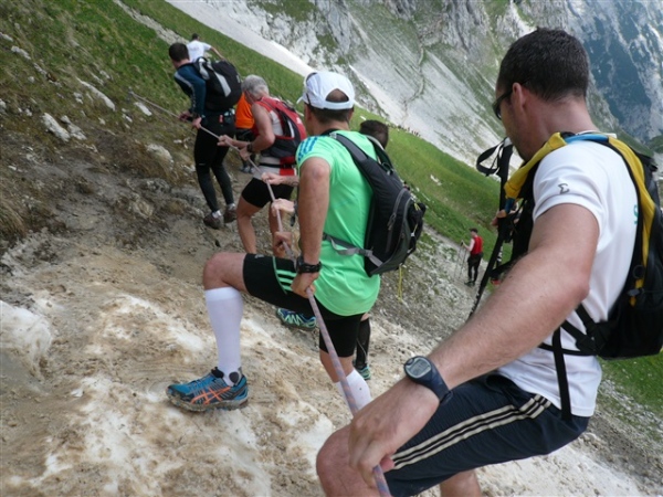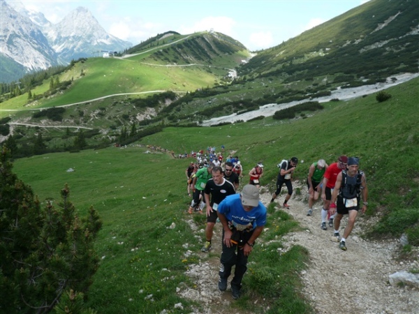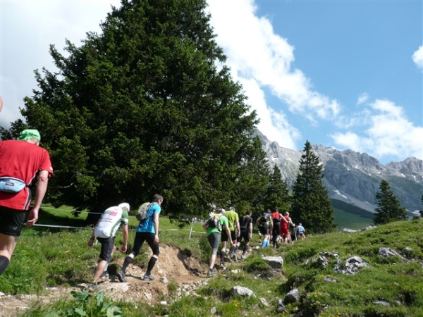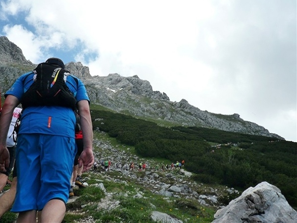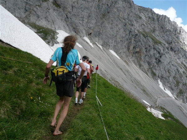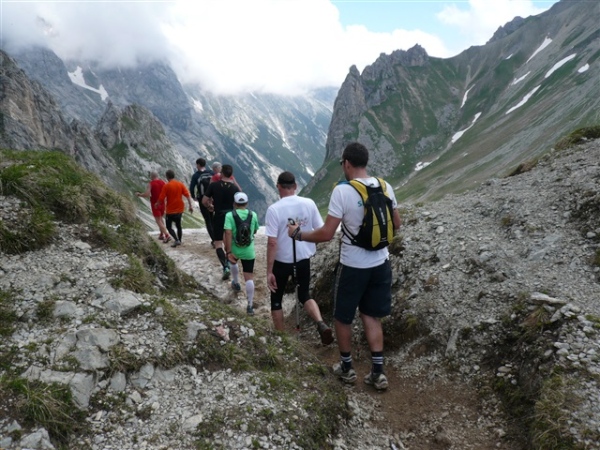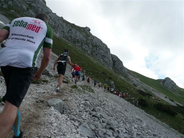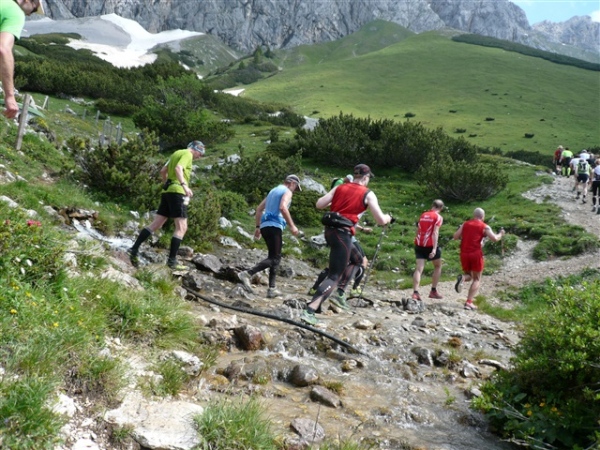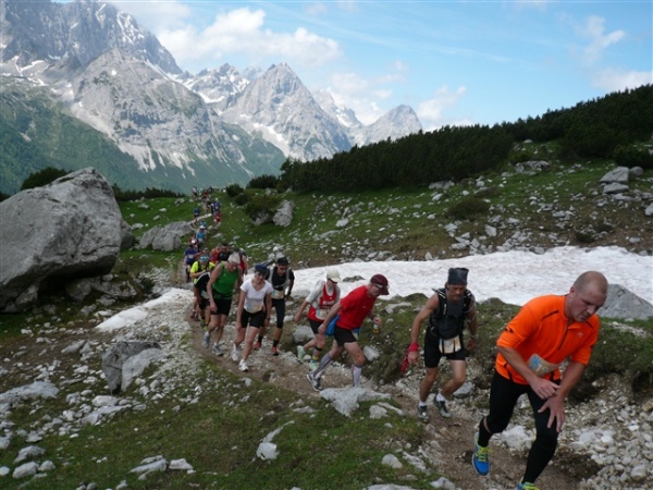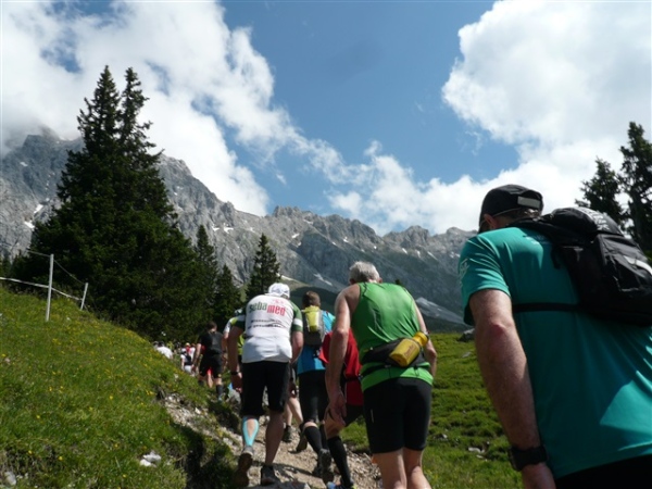 Sehr schnell gewinnen wir auf Geröll und Wiesenboden an Höhe, vor uns die phantastische Kulisse des Wettersteingebirges. Plötzlich ist der Weg auf einigen Metern überflutet und ich könnte mich ohrfeigen, die Goretex-Schuhe zuhause gelassen zu haben. Irgendwie gelingt es mir gerade so, trocken hinüberzukommen, nicht jeder schafft das und einige laufen schon ab hier mit feuchten Füßen. Der Weg wird immer anspruchsvoller: Die Wiese ist teils 20 – 30 cm ausgewaschen, immer wieder liegen Steine herum, auf die man nicht treten sollte, sonst kann der Lauf schnell vorbei sein. Die gesenkten Blicke, die ihr auf den Fotos sehen könnt, sind nur teilweise der Erschöpfung geschuldet, man muß sich einfach auf die unmittelbar vor einem liegenden nächsten zwei bis drei Meter konzentrieren.