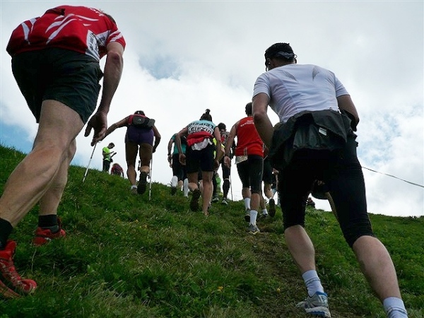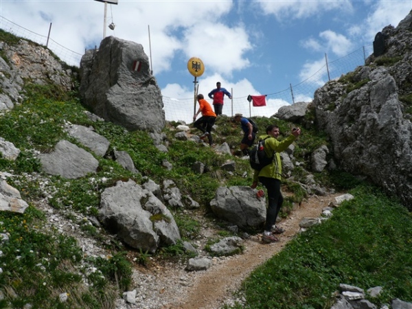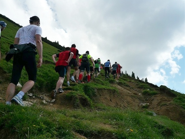 Die zweite Verpflegungsstelle an der Hochfeldern Alm kommt mir bei der heutigen Wärme schon fast zu spät und ich beglückwünsche mich, die große Flasche mitgenommen zu haben, die fast unabhängig macht. Wasser und Iso hinein, weiter geht’s. Und jetzt, 9 km sind es noch, ist Schluß mit lustig. Aber genau so wollen wir es ja: Weg vom Weg, Trail ist angesagt. Schnell wird mir klar, daß es ähnlich wie bei den Marathons an Jungfrau und Matterhorn werden wird: Oben heraus enge Pfade, die ein sinnvolles Überholen kaum möglich machen. Wer wirklich schnell sein will, muß vorne laufen. Wer, wie ich, irgendwo im Feld unterwegs ist, für den heißt es, sich immer wieder in Geduld zu üben.