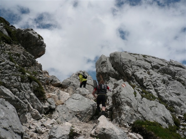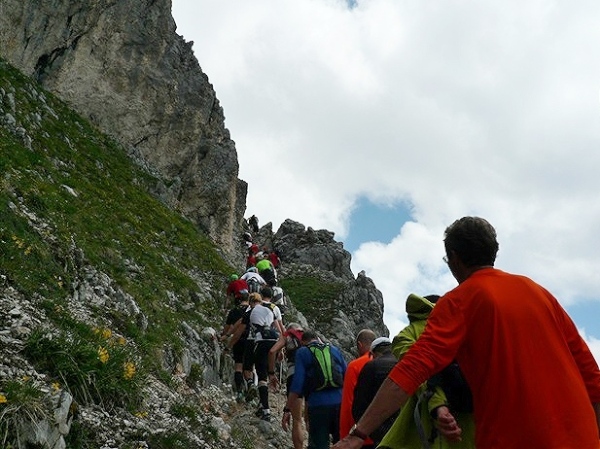 Nach einem weiteren „Abseilen“ ist in der Ferne ein Stau zu erkennen. Ein Grat ist zu überqueren, und das scheint so schnell nicht zu gehen. Was machen schon ein paar verlorene Minuten aus? Gar nichts, so bleibt mal Zeit, die Gegend ausgiebig zu betrachten, denn in der Bewegung muß ich doch immer wieder sehr genau den unmittelbar vor mir liegenden Weg betrachten. Mit erneuter Unterstützung eines Stahlseils ist auch das irgendwann geschafft. Und wie aus dem Nichts ist es plötzlich da.