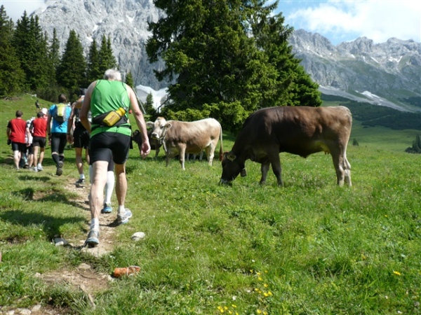 Ein Bild für die Götter sind die weidenden Kühe, die uns bis weit über 2.000 m begleiten. Sie sind völlig ruhig und an die vielen Menschen gewöhnt. Manchmal könnte ich sie anfassen, so nah bin ich ihnen. Der Weg ist jetzt gekiest, nicht mehr asphaltiert, immer noch gut zu begehen. Das jedoch wird sich sehr nachhaltig ändern. Ich ergötze mich bereits jetzt an einem Anblick, der uns bis zum Ziel nicht mehr verlassen wird: Wie an einer Perlenschnur sind die Läufer aneinandergereiht, nach vorne und nach hinten manchmal über hunderte von Metern zu beobachten. Der „Superman“ schwächelt bereits deutlich, aber auf ausdrückliche Aufforderung, auch mal wie ein solcher auszusehen, zwingt er sich nochmals kurzfristig zu einer positiven Geste. Das Gesicht spricht allerdings Bände.