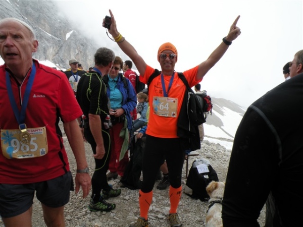 Mit der Seilbahn fahren wir hinauf zur Bergstation der Tiroler Zugspitzbahn auf 2.944 m Höhe und erkennen aus der Gondel, daß neben Wanderern auch einige Läufer den Schlußanstieg zu Fuß nehmen. Schon aus luftiger Perspektive sieht es abenteuerlich aus. Gut, dass ich das nicht riskiert habe. Obwohl, ich gebe es zu, ich habe im Vorfeld schon mit dem Gedanken gespielt. Auch den Fußweg zum Gipfelkreuz, den man nur mit alpiner Ausrüstung nehmen soll, verkneife ich mir. Ich sehe einige die steilen Abschnitte heraufeiern und wieder herunterrutschen, auch die Leiter ist nicht ohne, das muß nicht sein. Eine schier unendliche Stunde Wartezeit benötigt es, bis wir endlich in der Gondel talwärts sausen können und nach wenigen Minuten wieder im Tal sind, wo wir heute Morgen gestartet sind. Erfreulicherweise bringt uns ein Shuttlebus direkt nach Ehrwald zurück, wo wir uns noch die Siegerehrung anschauen, die kurz danach beginnt.
