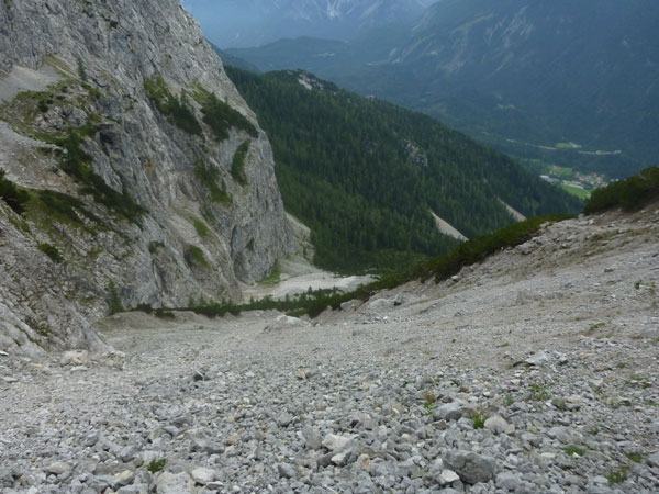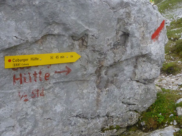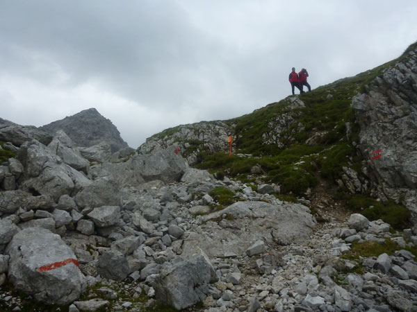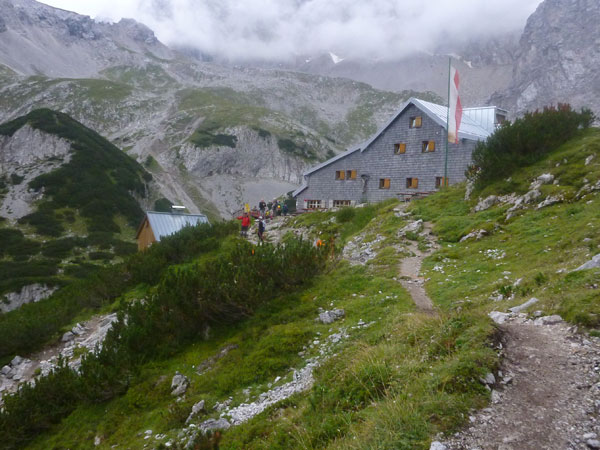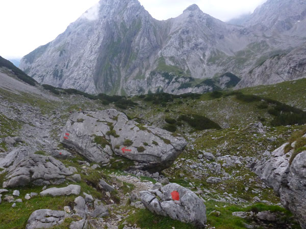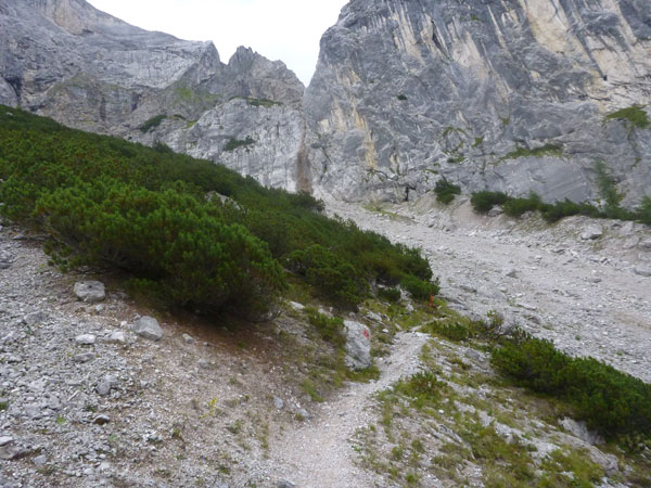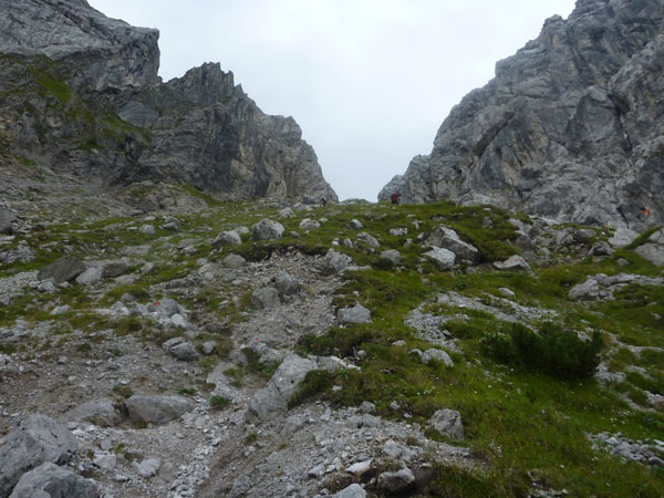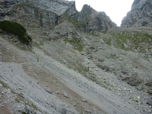 Kurz oberhalb der Wolfratshauser Hütte (1750 m) erreichen wir den Rand des Talkessels und höchsten Punkt des zweiten Aufstieges. An allen heiklen Stellen stehen Bergwachtler bereit, was man auch mal lobend erwähnen muss.