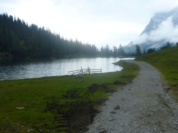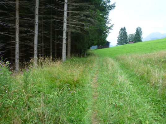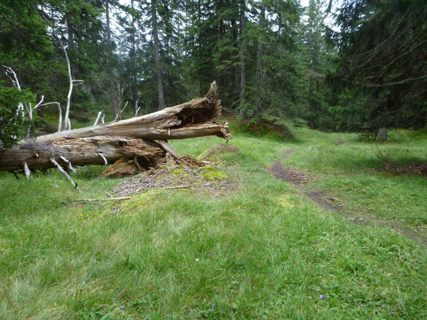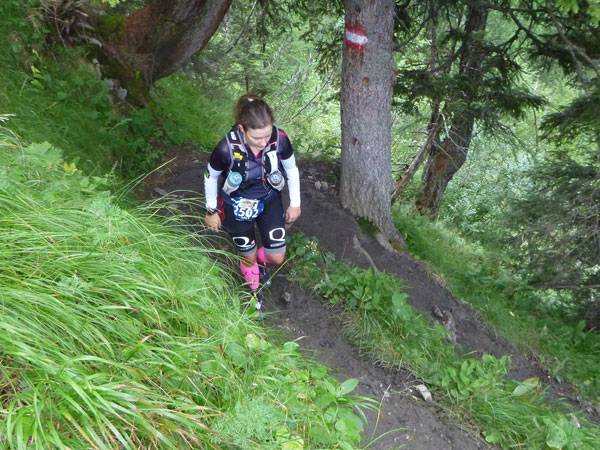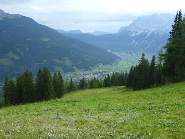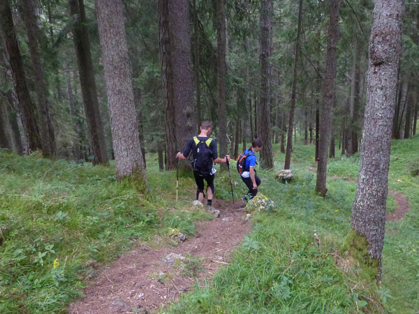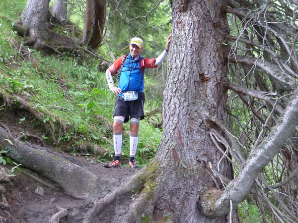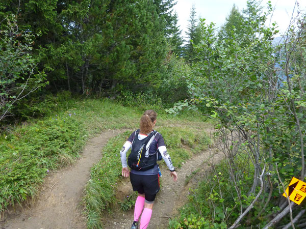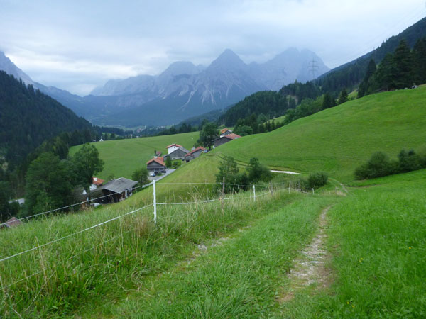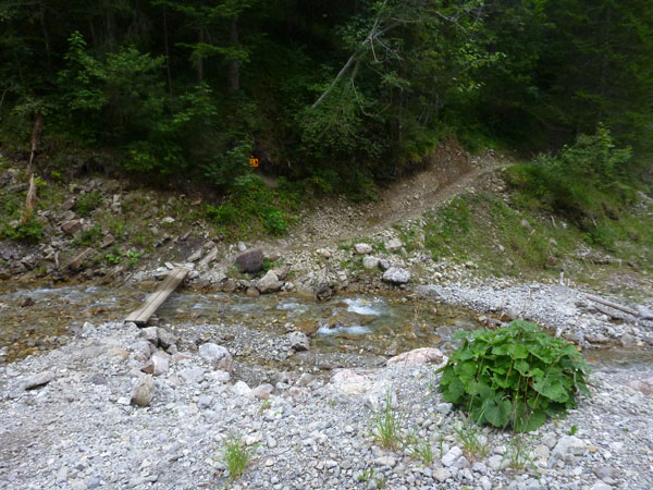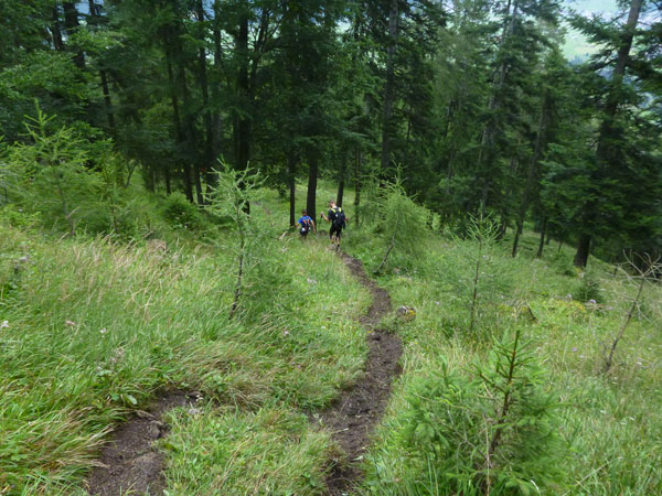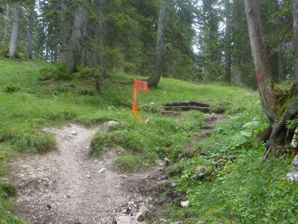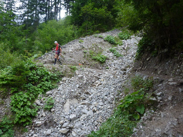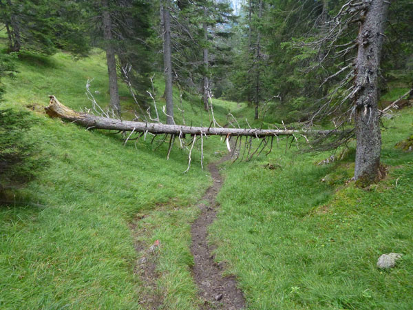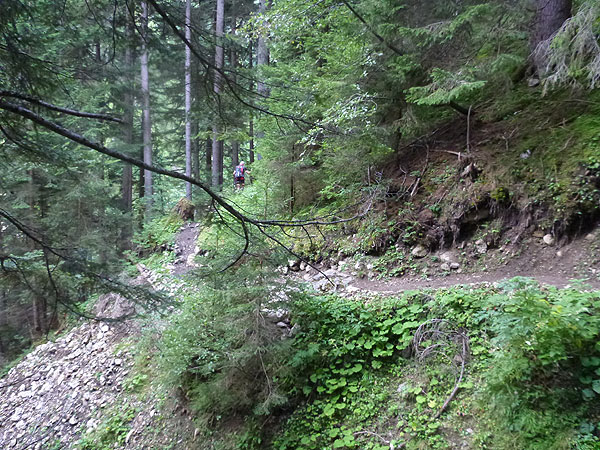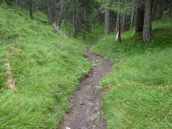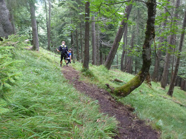 Bis zum nächsten Aufstieg sind 2 km im Tal zu überbrücken, mal leicht rauf, mal runter geht es auf wechselnden, gut zu laufenden Untergründen etwas oberhalb der Fernpassstraße weiter. Nach dem Weiler Obergarten verschwinden wir im Wald. Ein Holzbrett sorgt für eine trockene Überquerung eines Baches. Bis zur Gartneralm geht es im Wald auf schmalen Pfaden nach oben, manchmal bricht der Hang steil nach unten ab. Ziemlich einsam bin ich mittlerweile unterwegs, das Läuferfeld hat sich seit dem Abstieg vom Grünen Ups weit auseinandergezogen.