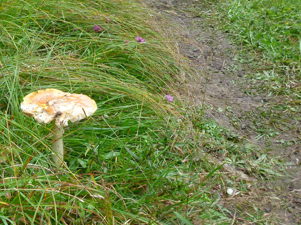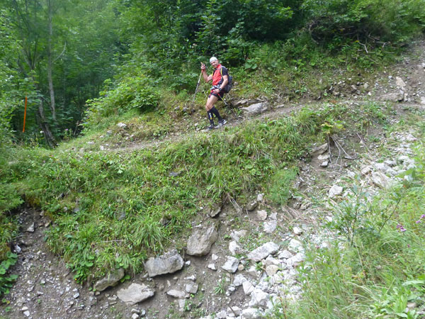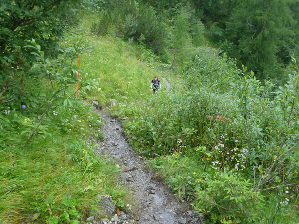 Anfangs noch moderat nimmt das Gefälle immer mehr zu. So schön der Pfad zu laufen ist, er ist auch ein richtiger Oberschenkelkiller. Es wird immer schwieriger, sich im Lauftempo auf den Beinen zu halten. Absitzgarantie ist hier inbegriffen. Diesen Berg will ich aber noch ohne Unterstützung meiner Stöcke bewältigen, sie behindern beim Fotografieren ungemein und heute ist Zeit Mangelware. Daher bleiben sie vorerst noch am Rucksack.