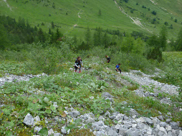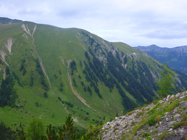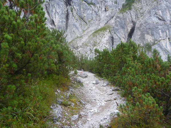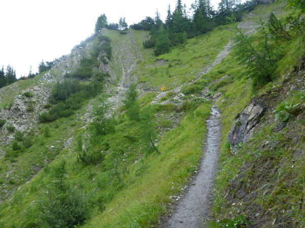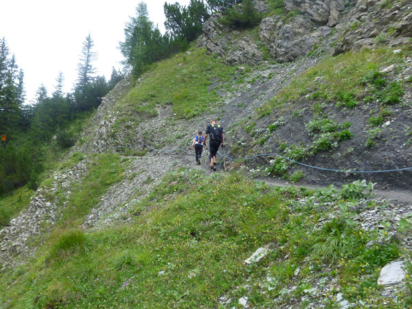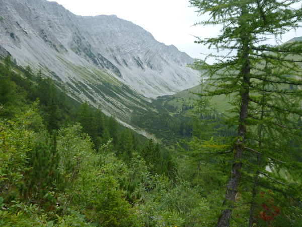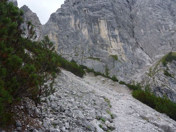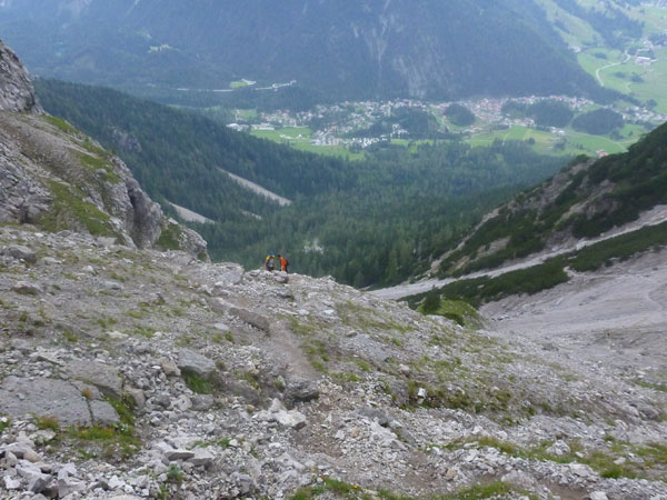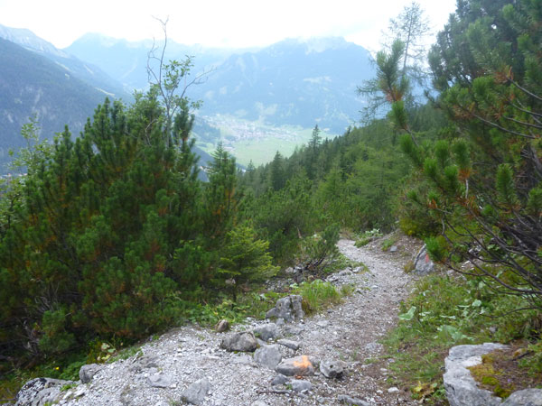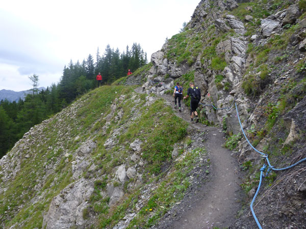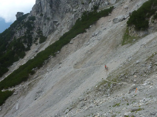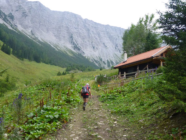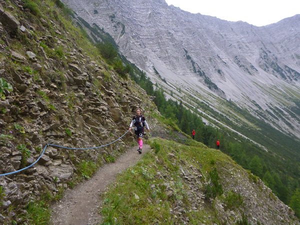 Dafür wird ab Gartneralm (1400m) der Ausblick richtig imposant, vor uns liegen jetzt das Gartnertal und das gewaltige Massiv der Gartnerwand mit seinen zerfurchten Schrofen. Sie gehört zu den Lechtaler Alpen. Für versierte Kletterer gibt es oben eine 3 km lange Gratwanderung. Einige hundert Meter links davon führt unser Trail in Serpentinen steil nach oben zu einem Übergang. Hier sind auch wieder steilabfallende Abschnitte zu passieren, die teilweise auch mit Seilen gesichert sind. 700 Höhenmeter beinhaltet der Aufstieg, der schon dem ein oder anderen schwer zu schaffen macht.