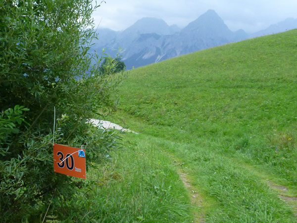 Kilometerbezeichnungen sind Mangelware, daher weiß man nie ganz genau, wieviel Zeit bleibt. Alle 5 Kilometer werden die Entfernungen zum Ziel angezeigt, wobei ich nicht alle entdecken kann. Ich befürchte, es wird eng mit dem Zeitlimit. Fotostopps kann ich mir leider nur mehr vereinzelt leisten. Wenigstens hält sich das Wetter. Beim Briefing am Morgen wurden für den Nachmittag Regenfälle angekündigt.