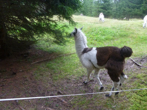 Auf einer Teerstraße geht es gleich ordentlich bergauf weiter. Nach einer Weide mit Lamas zweigen wir ab in den Wald auf einen Trampelpfad. Eine große Gruppe Wanderer, die von oben herunter kommt, feuert jeden Entgegenkommenden mit donnerndem Applaus und Zurufen an. Der Beifall hallt durch den Wald wie bei einem Großereignis. Nur mühsam und sehr langsam komme ich hier voran, es geht richtig streng nach oben.
