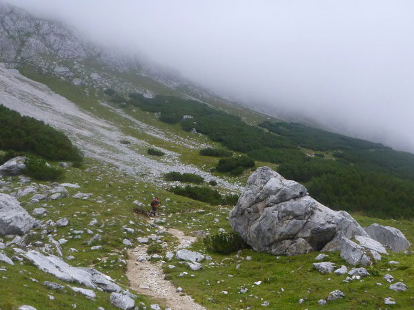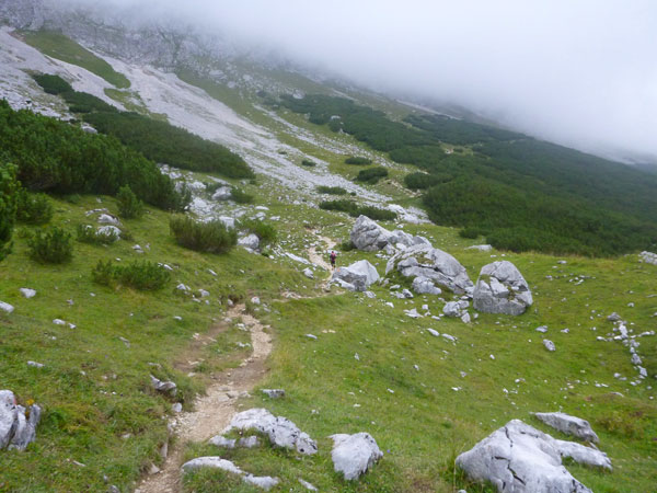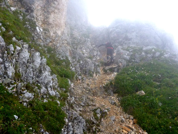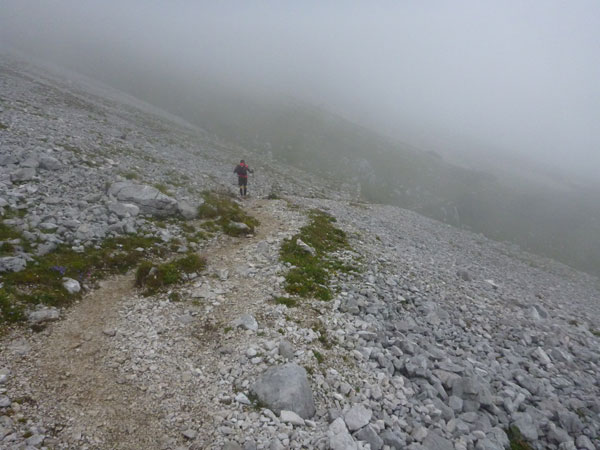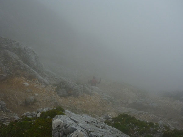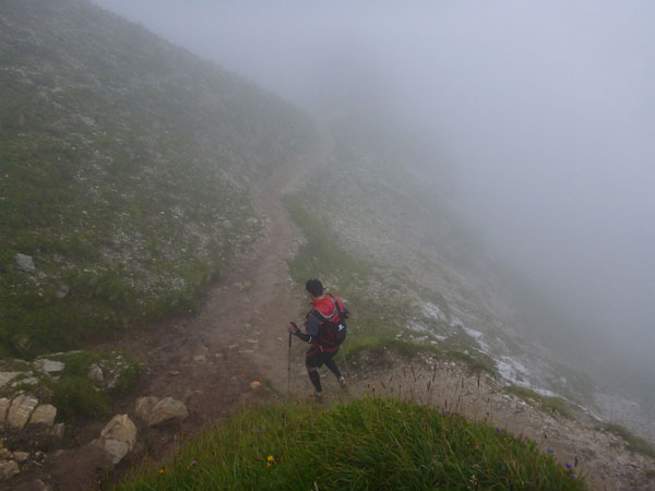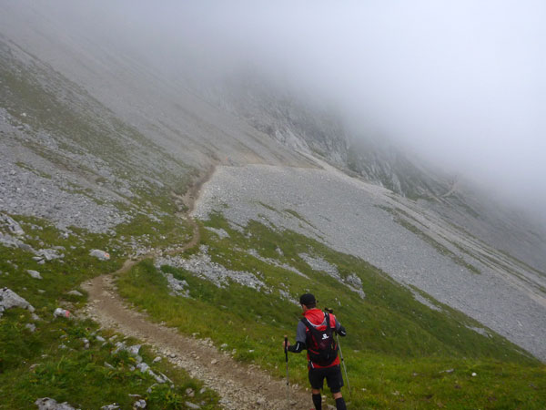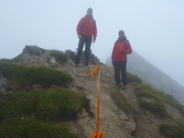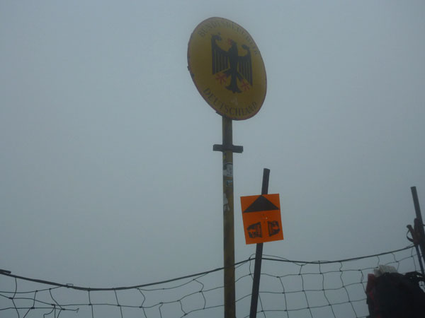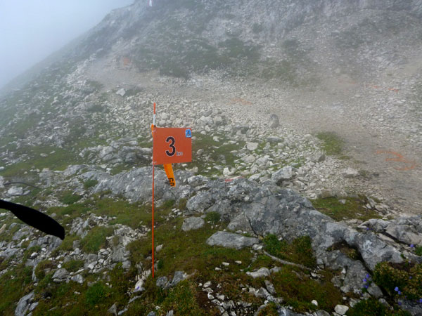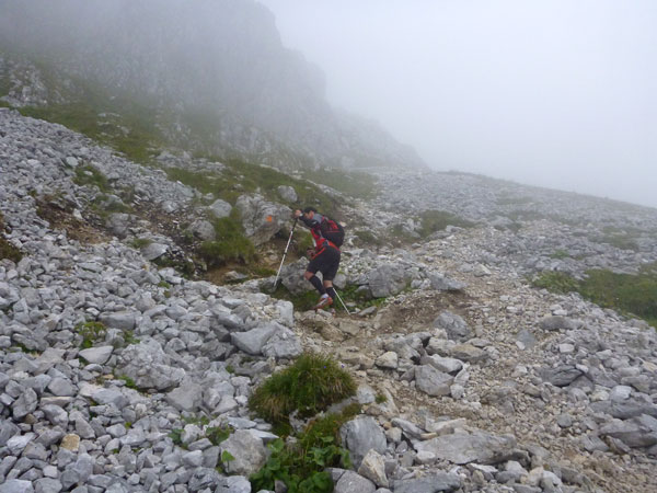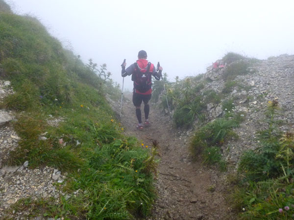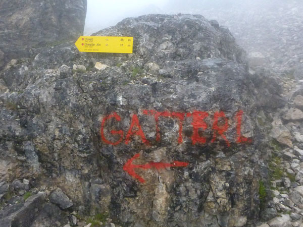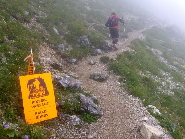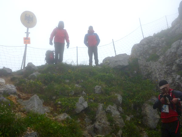 Über Wiesen und Geröllfelder geht es nochmals kurz bergab Richtung Gatterl. Ein Fixseil erleichtert den kurzen steilen Aufstieg zum Grenzübergang am 2024 m hohen Gatterl. Hinter Andreas erreiche ich die Grenze nach Deutschland. Er ist der einzige Teilnehmer, mit dem ich auf dem Abschnitt Pestkapelle – SonnAlpin in Kontakt komme. Im dichten Nebel warten die aufmerksamen Männer der Bergwacht bereits auf uns. Ich bin im Übrigen nicht der Letzte, der hier noch vorbei muss. Es liegen noch drei Läufer hinter mir.