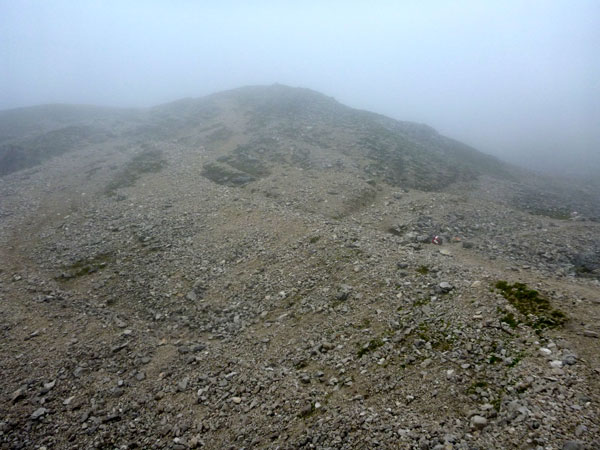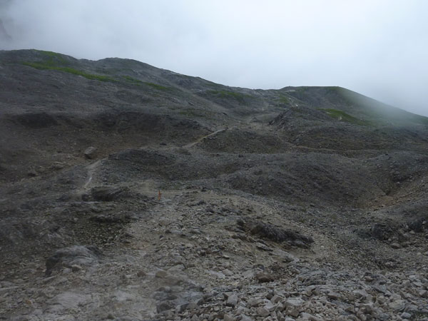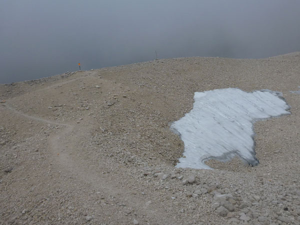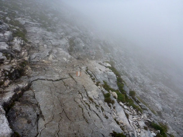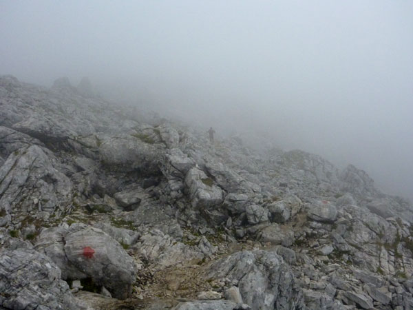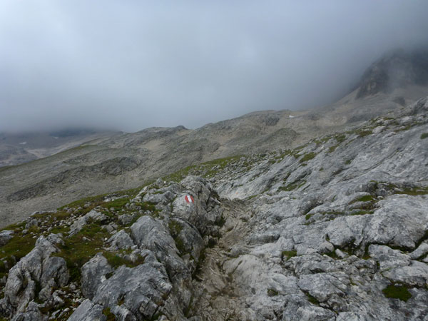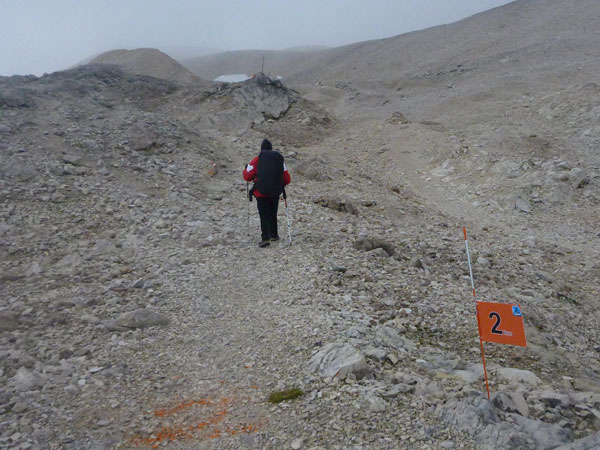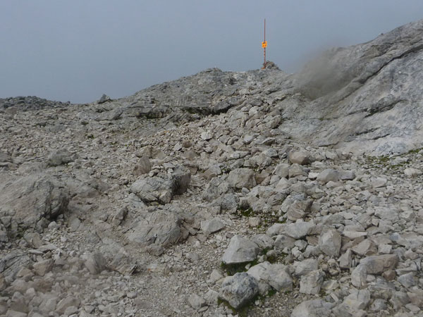 Weiter geht es auf dem Plattsteig durch die karge Karst-Landschaft des Zugspitzsplatts. Die letzten fünf Kilometer sind sogar in Kilometerschritten ausgeschildert, wobei sich die Entfernung immer noch auf eine Zielankunft auf dem Gipfel bezieht. Ich darf also 800 Meter abziehen. Nach einer halben Stunde hört es wieder auf zu regnen und nach Durchschreiten der ersten Wolkenschicht wird es sogar wieder etwas heller und die Sicht besser. Für ein grandioses Panorama reicht es natürlich noch lange nicht.