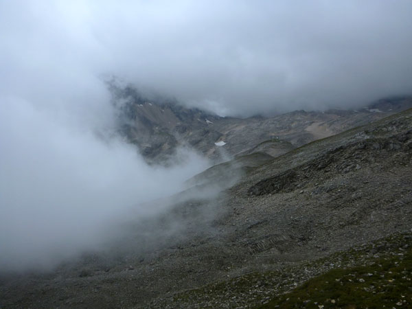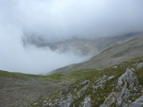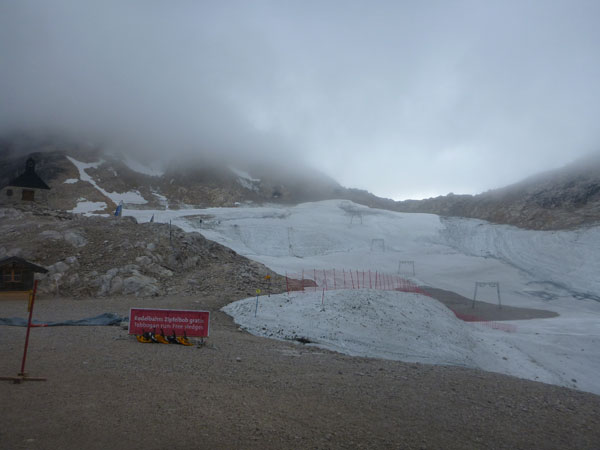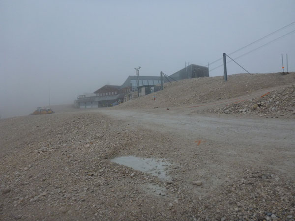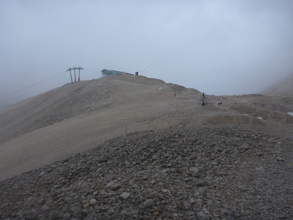 Auch die an den Flanken der Zugspitze befindlichen drei Gletscher, darunter die beiden größten Deutschlands, der Nördliche Schneeferner und der Höllentalferner, sind kurz vor SonnAlpin nicht auszumachen. Vom Gipfel kann ich nicht einmal etwas erahnen. Es hat für mich ein bisschen was von einer Mondlandschaft. Das kann ja auch durchaus etwas Reizvolles haben.