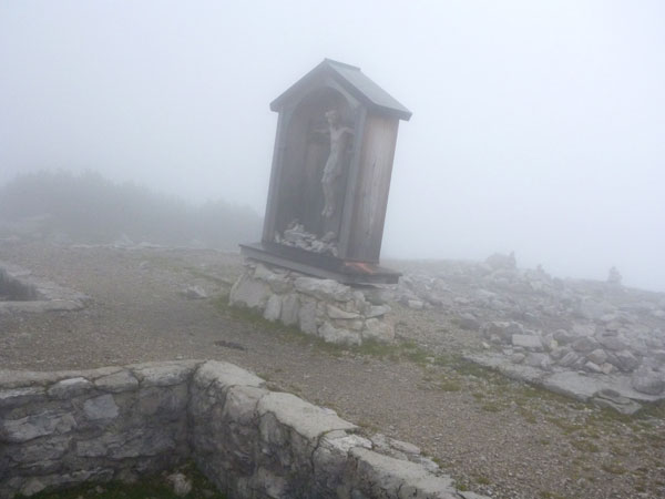 Ein kurzes Stück später passiere ich die Zugspitzkapelle. Seit 1953 findet hier jährlich die Gatterlmesse statt. Zum Gedenken an den Lawinentod von vier bayerischen Grenzpolizisten und an alle tödlich Verunglückten im Zugspitzgebiet. Im Dezember 1952 ging am Gatterl eine riesige Lawine ab. Dabei verunglückten die Beamten und ein österreichischer Bergtourist. Die nächste Messe findet am 14. September statt.