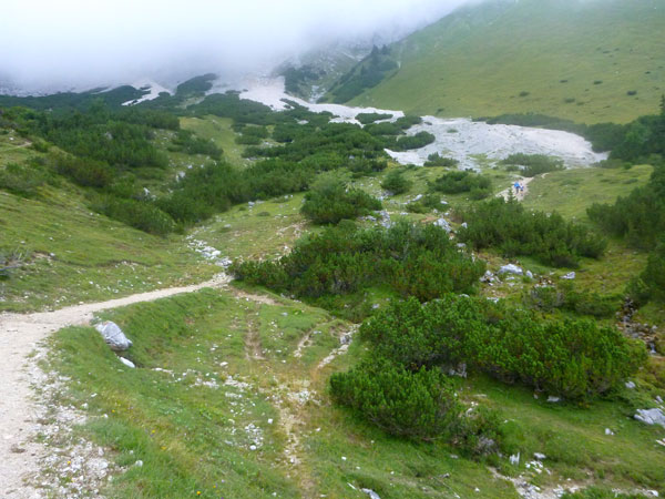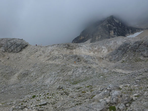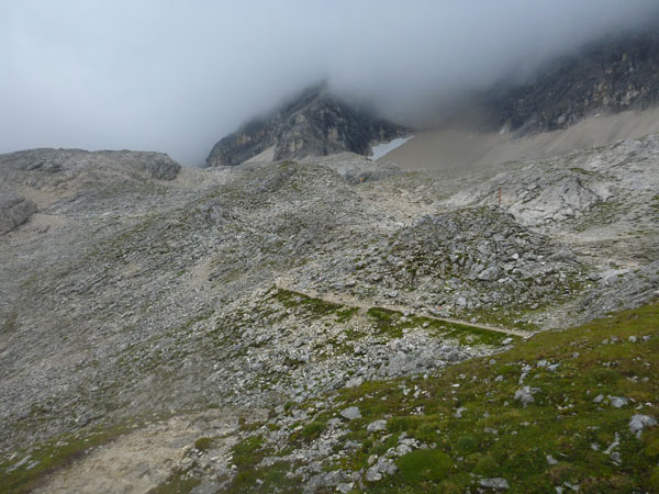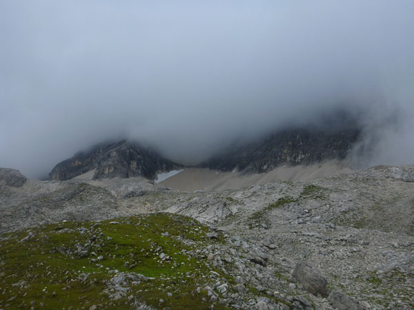Durch eine Steinwüste erreiche ich über den fast ebenen Plattsteig die Knorrhütte, die 1855 die erste Hütte im gesamten Wettersteingebirge war.108 Übernachtungsplätze stehen zur Verfügung. Sie liegt unmittelbar am Abbruch des Zugspitzplatts zum Reintalanger in aussichtsreicher Lage mit großer Sonnenterasse. Heute ist niemand zu sehen und leider ist auch nicht ansatzweise etwas von der Umgebung zu sehen.