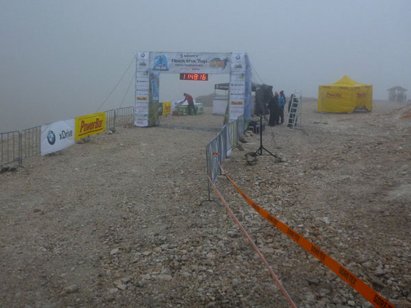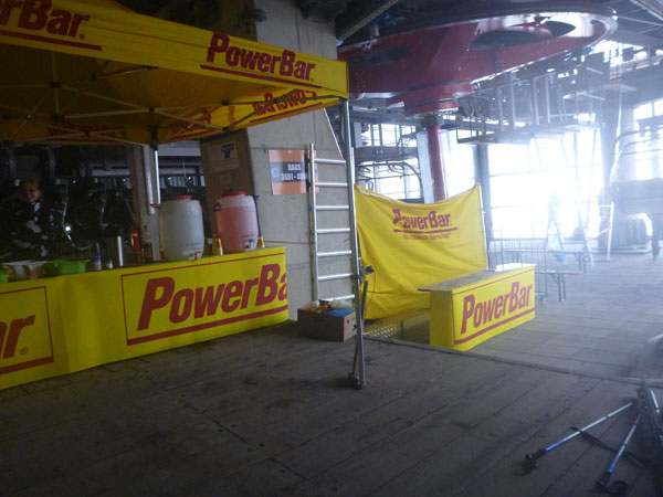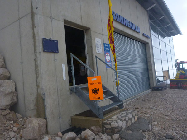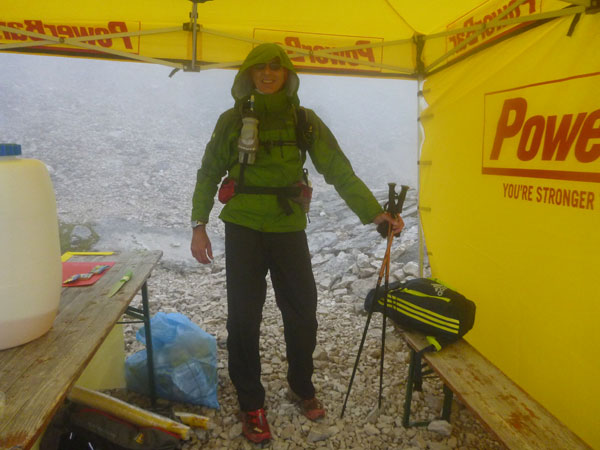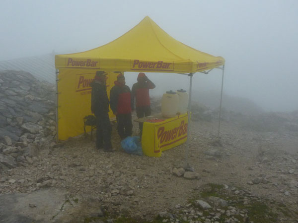 Vor der Hütte ist die Bergwacht mit einem Unterstand präsent. Für alle Teilnehmer gilt hier und heute die Vorschrift, auf lange Hosen und Jacken zu wechseln. Als ich gerade am Auspacken bin, fängt es zu schütten an. In aller Ruhe nehme ich somit gleich einen kompletten Klamottenwechsel vor. Als ich fertig bin, ist das Schlimmste auch schon wieder vorbei und es regnet nur mehr schwach.