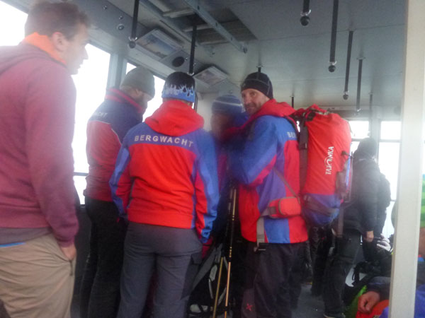 In der Bergstation der Sonnenkar-Bahn hat man zwischen den geparkten Gondeln etwas eingeheizt und unsere Wechselklamotten deponiert. Es gibt heiße Getränke, warme Brühe und auch genügend zu knabbern. Nach unten ins Tal geht es von SonnAlpin nicht. Zuerst geht es, exklusiv nur für die Trailer, nach oben. So kommen wir dann doch noch alle aufs Top of Germany. Zu sehen gibt’s oben heute freilich nichts, rein gar nichts. Somit muss auch keiner traurig sein, den Gipfelsturm „per pedes“ verpasst zu haben.