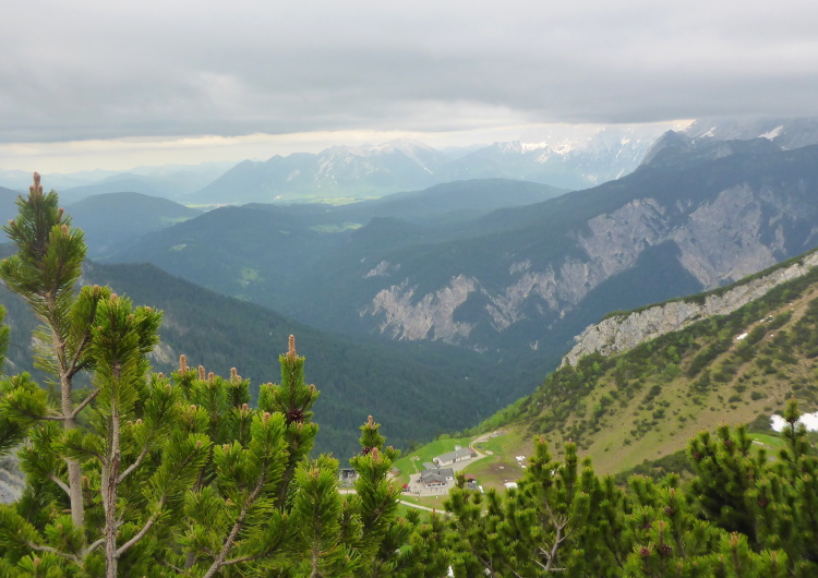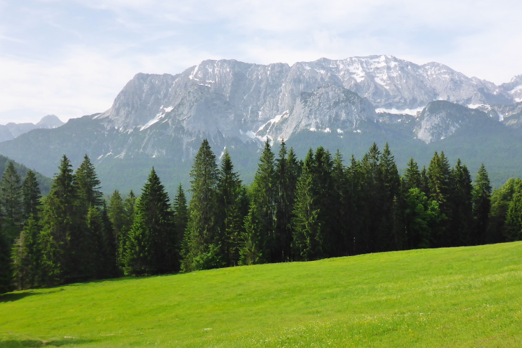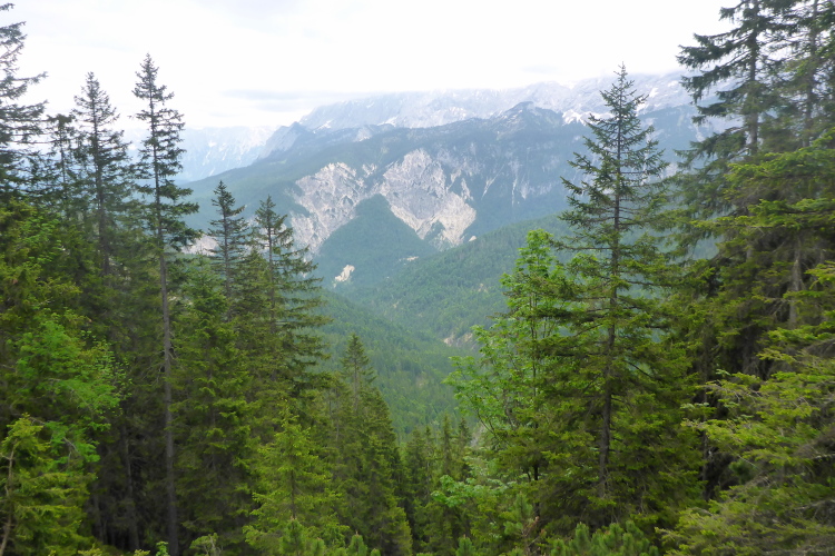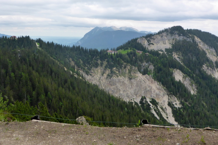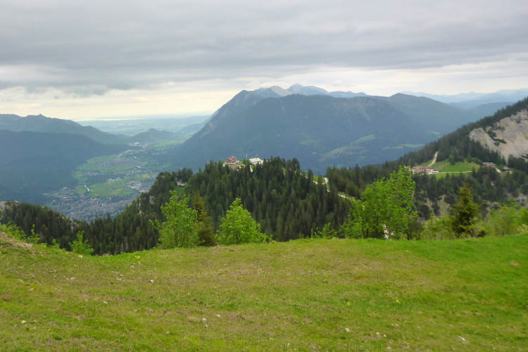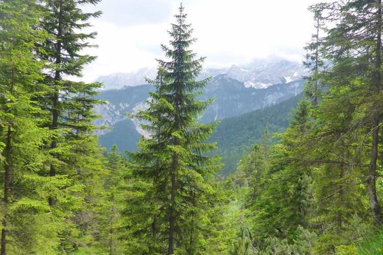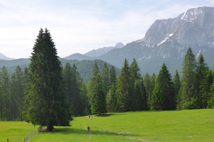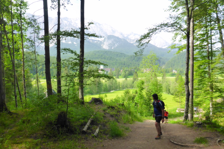 Ein schmaler Pfad führt uns erneut bergauf. Bevor ich im Wald verschwinde, drehe ich mich noch einmal um. Die Aussicht ist umwerfend: Schloss Elmau liegt unter mir umrahmt von dunklem Wald und dem Wettersteinmassiv.