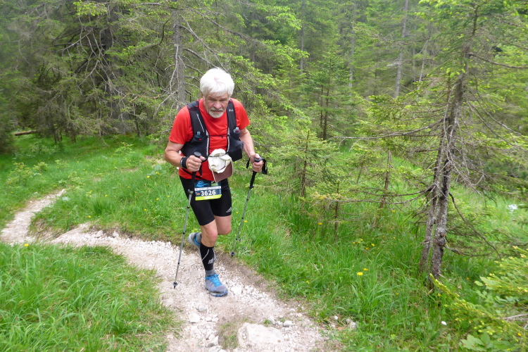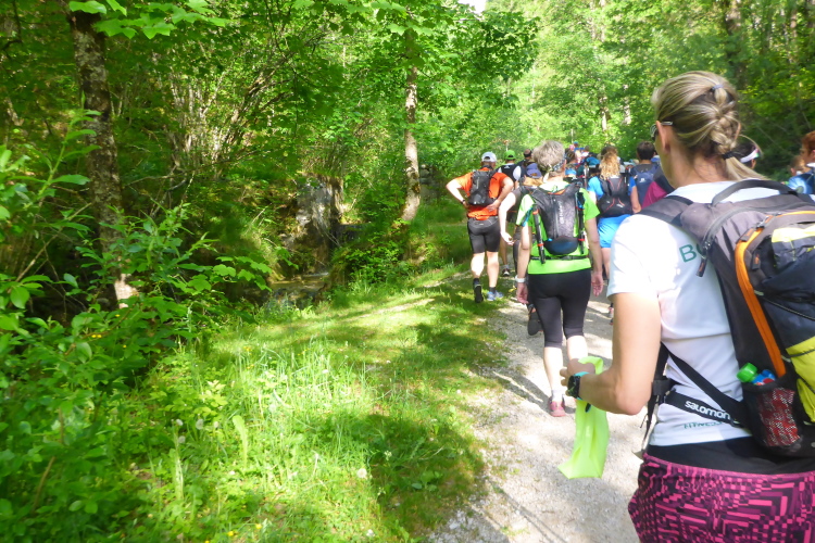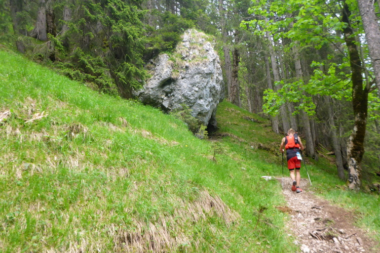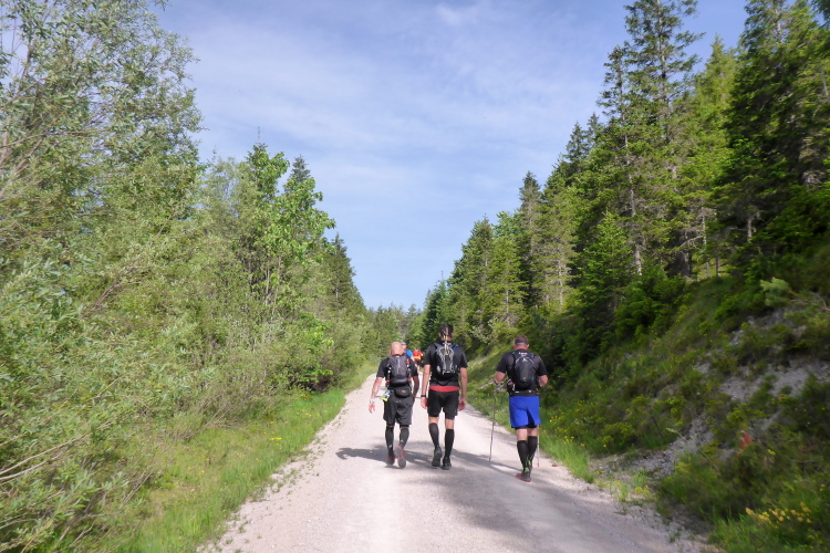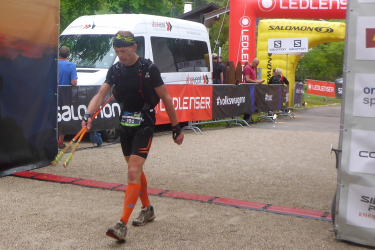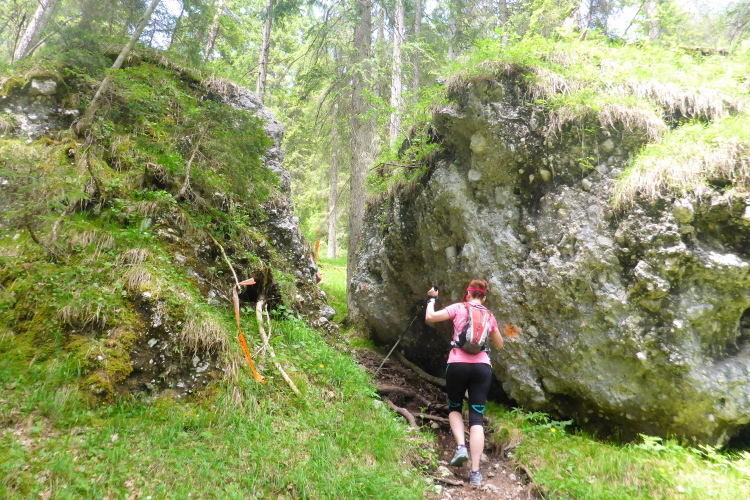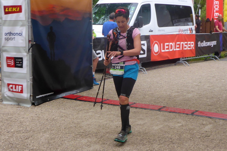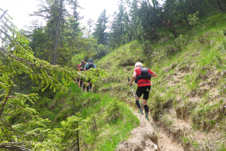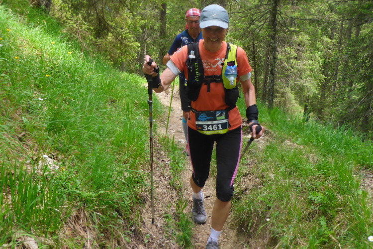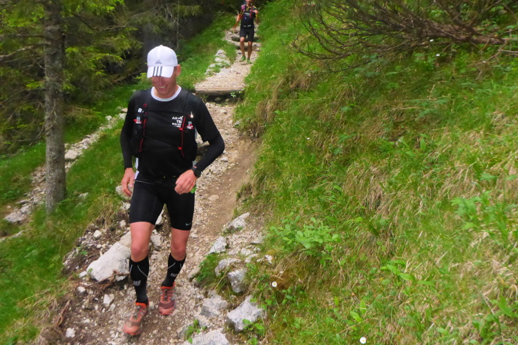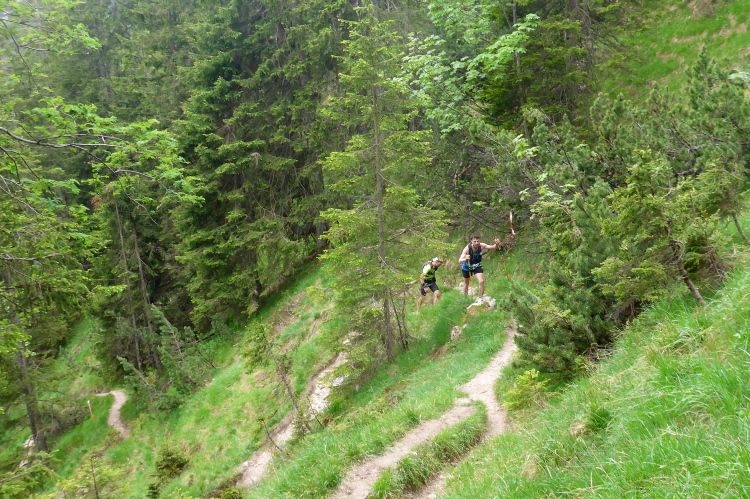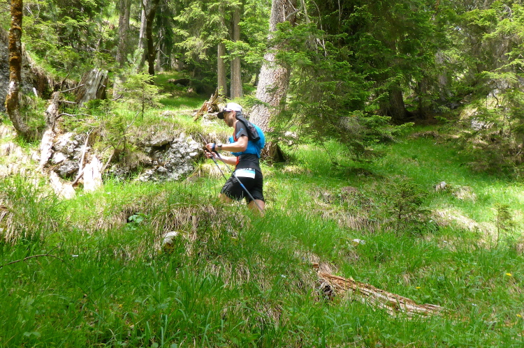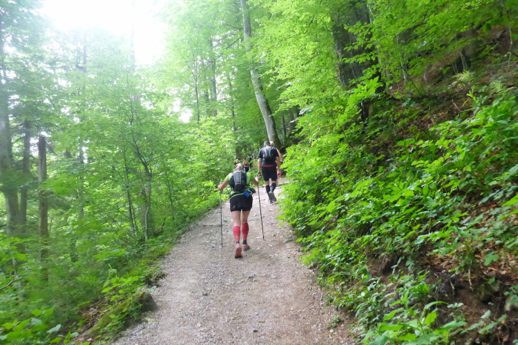 Die ersten Meter muss ich hinunter rutschen, so steil ist es. Im Wald wird es etwas besser. Eine Läuferin benutzt ihre Stöcke als Krücken, denn sie ist am Bein verletzt, die Bergwacht ist schon informiert und auf dem Weg. Bestürzt unterhalte ich mich mit einer anderen Läuferin, die bemerkt hat, wie unsicher ich auf den Beinen bin. Sie bietet mir einen Stock als Hilfe an, aber ich lehne ab. Mir fehlt die Technik, um jetzt ein Experiment zu wagen.